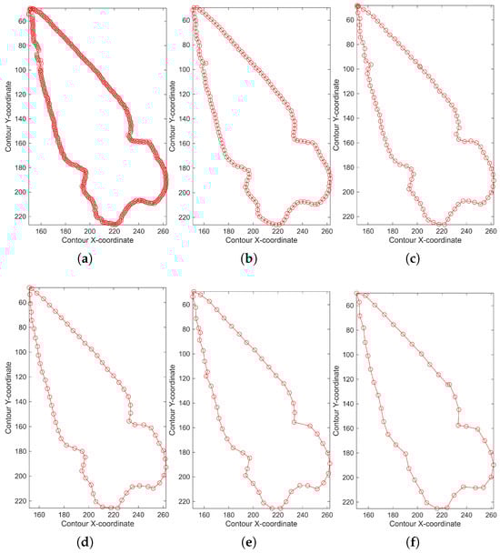 Furthermore, strong geometric coherence is maintained because the sampling relies on the spatial selection of points in the plane. This is an advantage over uniform sampling schemes based solely on position within a discrete chain, since spatial selection adapts to the local geometry of the contour rather than depending on fixed intervals that may be insensitive to structural variations.
