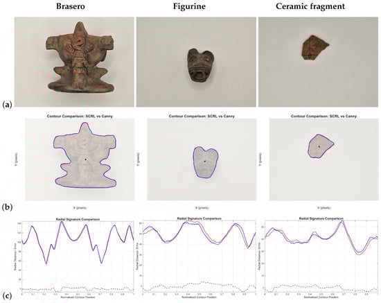 Comparison between LRCT and Canny+Moore applied to three ceramic elements: (a) original image; (b) detected contours (red: LRCT, blue: Canny+Moore); (c) radial signatures and differences between curves (black dashed line). This case evaluates performance under irregular shapes and tonal variations characteristic of pottery, one of the most abundant archaeological materials.