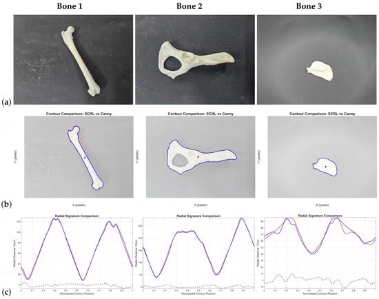 Comparison between LRCT and Canny+Moore applied to bone fragments: (a) original image; (b) detected contours (red: LRCT, blue: Canny+Moore); (c) radial signatures and curve differences. Bone presents naturally nonlinear geometries, useful for evaluating method stability along smooth edges.