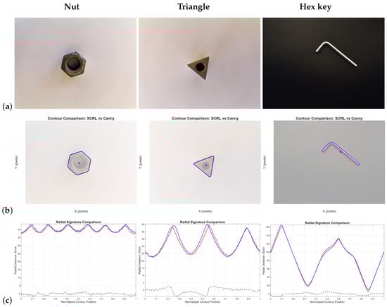 Comparison between LRCT and Canny+Moore applied to metallic objects: (a) original image; (b) detected contours (red: LRCT, blue: Canny+Moore); (c) radial signatures and curve differences. The evaluation focuses on straight contours and abrupt direction changes.