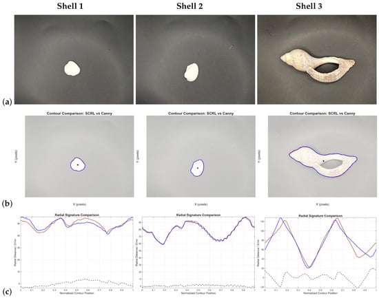 Comparison between LRCT and Canny+Moore applied to shell elements: (a) original image; (b) detected contours (red: LRCT, blue: Canny+Moore); (c) radial signatures and curve differences. These cases assess performance under irregular edges with undulations and zigzag patterns.