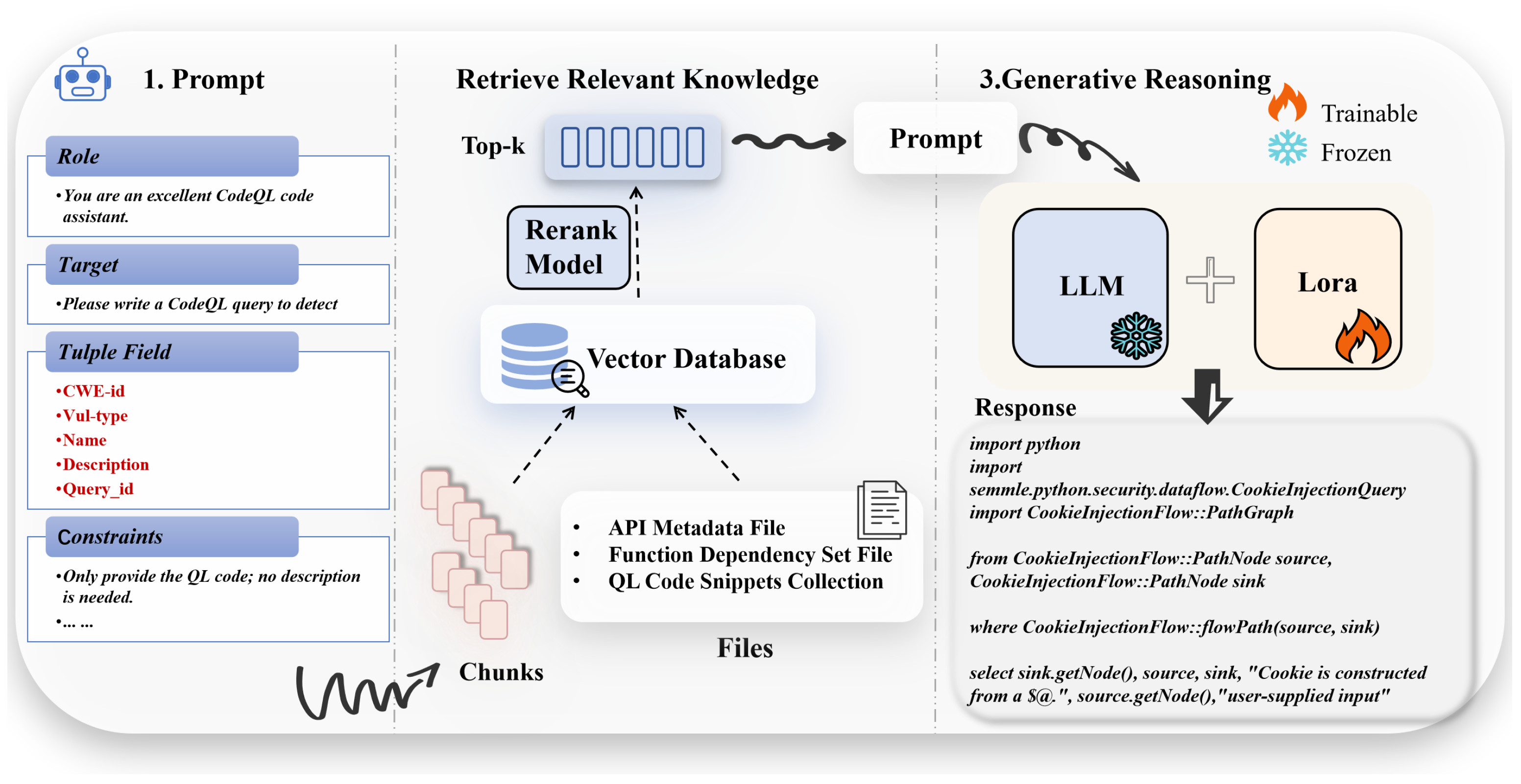 Inference and Generation Module: When the user inputs a natural language query, the system first retrieves relevant background knowledge via RAG. The retrieved information is then concatenated with the user input and fed into the fine-tuned model to generate high-quality QL code. This module achieves the automatic transformation from natural language to executable QL queries, significantly improving the efficiency and accuracy of vulnerability detection rule development.