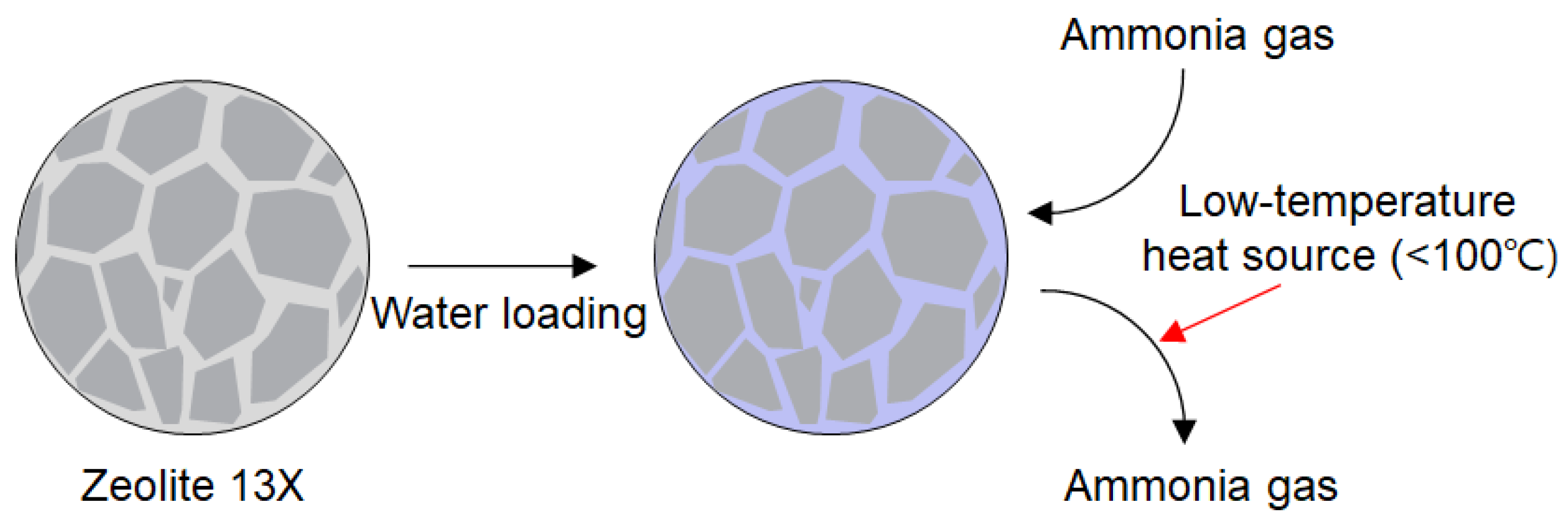 | Zeolite 13X@H2O | NH3 gas 1–5 bar, 25 °C Closed system | 6.5 mmol/g | 80 °C | [28] |