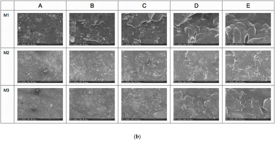 (a) SEM analysis with LVD detector (A—500×, B—1000×, C—5000×, D—10,000×, and E—25,000×). (b) SEM analysis with EDT detector (A—500×, B—1000×, C—5000×, D—10,000×, and E—25,000×).