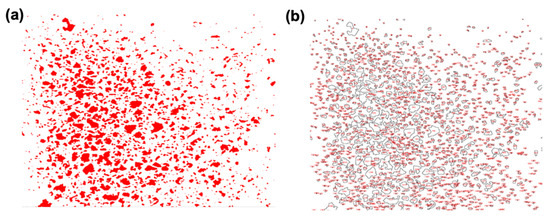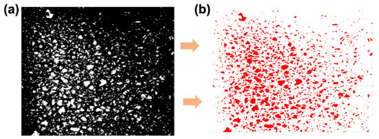 The area and number of convex areas can be summarized by the Image J software, and then the surface texture distribution of the PERS mixture can be characterized by the area, number, and area ratio of the convex areas within the effective diameter of each small area. To accurately analyze the texture structure distribution of PERS, the binarized specimen image can be operated using the Image J software. The contrast between the convex research object and the background in the image was processed, and the background separation of the PERS mixture is shown in Figure 5. Next, the analyze particles function in Image J can be used to capture the target object and obtain the specific quantity and area of the convex area, as shown in Figure 5b. After an area of the small convex region was obtained, the convex object image in different diameters can be analyzed by introducing the equivalent diameter. Meanwhile, to facilitate calculation, the convex region can be regarded as a circle, and the equivalent diameter can be calculated according to the diameter and the area of the circle, as shown in Equation (10):