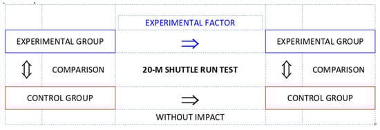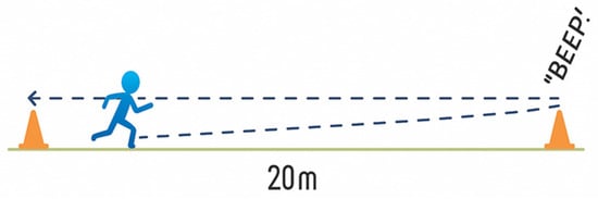 In the study, an endurance shuttle run test was used (Figure 2) to determine cardiorespiratory capacity. The test started with a steady pace of 8 km/h. Then, the running speed increased by 0.5 km/h every minute. The participants ran a 20 m section back and forth, touching the finish line with one foot. The running was executed at a set pace, indicated by a beep. The subject completed the test if they did not reach the line at a distance of at least 3 m before the beep sound for 2 consecutive running sections. The test result was the number of completed sections [14]. The shuttle run test is a standardized, incremental protocol commonly used to induce progressively increasing cardiorespiratory load. Although direct physiological indicators of exercise intensity were not recorded, the same test protocol was applied in both groups to ensure comparable external workload progression.