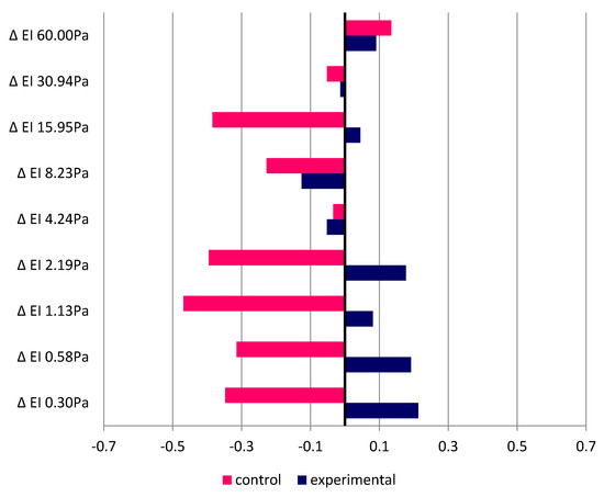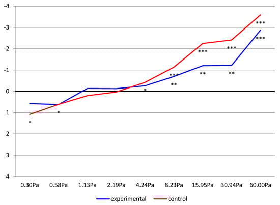 Figure 4 presents the Rosnow and Rosenthal d-index for differences between pre- and post-exertion measurements in both study groups, with the levels of statistical significance to highlight the most important effects. The representation of the data in the form of a polygonal chain reflects the profiles of EI changes as a function of the particular shear force values selected. This allowed us to demonstrate the differences between the control and experimental groups and confirmed the analyses performed in the study.