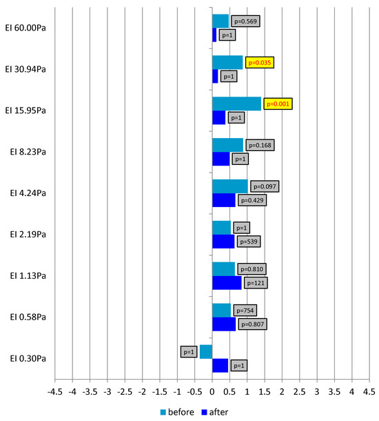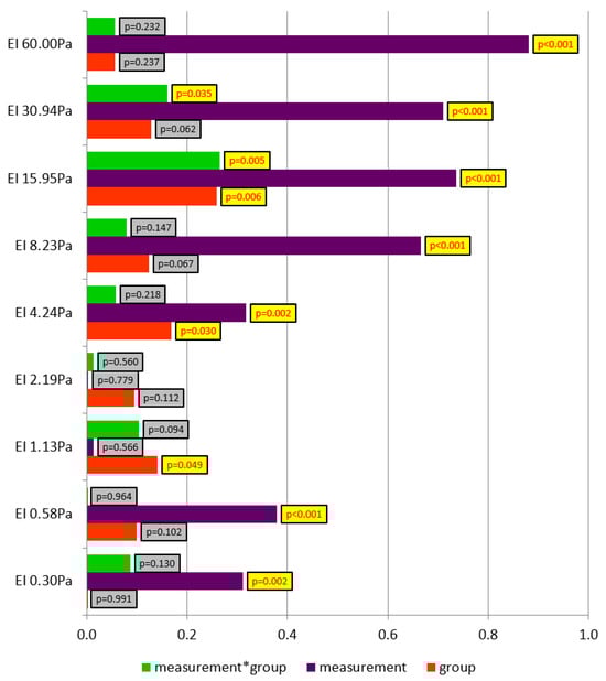 Figure 6 presents partial eta-squared values for the analyzed factors, including the levels of test probability. The dependent variable was explained the most by measurement repetition. In the majority of cases, the measurement factor proved to be highly or extremely statistically significant. A large effect was observed at higher shear forces. Partial eta-squared above 50% was identified for measurements at shear forces in the range of 8.23–60.00 Pa. The conducted running test significantly changed EI in both study groups.