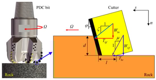 In the interaction between the drill bit and the formation rock, the axial and rotational motions of the bit are inherently coupled. Such coupling involves both the downward penetration of the bit into the rock under WOB and the rotational shear of the rock induced by TOB. These complex interactions significantly influence the dynamic response of the drill string system. This paper employs the well-established bit–rock interaction model developed by Detournay and Defourny [26], which effectively divides the interaction process into cutting and friction processes, as illustrated in Figure 3.