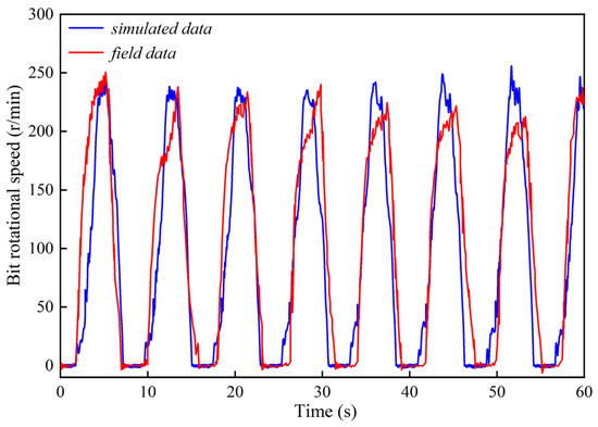 To analyze the vibration behavior of the drill system under compound impact loads, the fourth-order Runge–Kutta method was employed to solve Equations (1)–(14). Due to the absence of field measurement data specific to CPD, this paper adopts an indirect validation strategy. We first validate the consistency between the degenerated conventional drilling model and the field data from Ritto et al. [27] to ensure the accuracy of the fundamental dynamic parameters. On this basis, the dynamic analysis of CPD is conducted by superimposing theoretical impact loads. The drill string configurations utilized in the field tests and simulations are summarized in Table 1, and the drill string element size is set to 25 m during the simulation [28]. A comparison of the measured and simulated rotational speeds of the bit is presented in Figure 5.