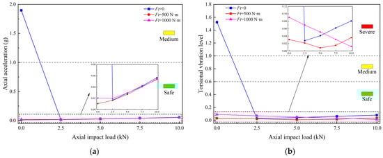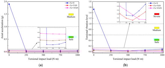 Effect of impact frequency on vibration characteristics of drill bit: (a) Axial acceleration; (b) Torsional vibration leve.