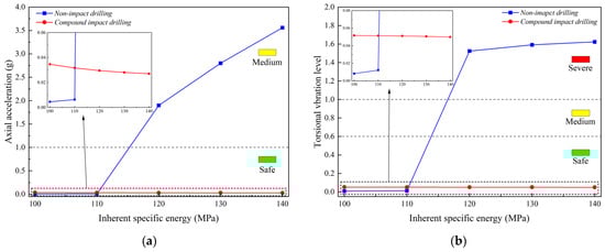 This subsection presents a comparative analysis of the bit vibration characteristics under varying rock strengths for both non-impact drilling and CPD. Numerical simulations were performed across five levels of intrinsic specific energy, ranging from 100 MPa to 140 MPa in 10 MPa increments. The effects of rock strength on vibration behavior under the two drilling modes are illustrated in Figure 14.
