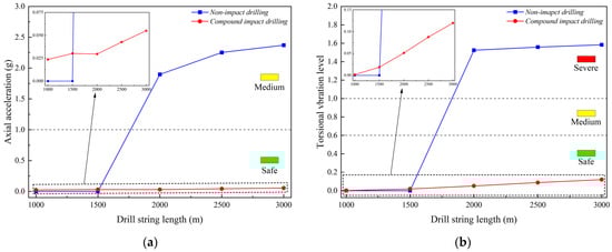 As depicted in the figure, vibration intensity shows a clear positive correlation with drill string length. Both vibration modes experience a marked intensification as the length of the drill string increases across all drilling methods. During non-impact drilling, the bit remains within a safe vibration range when the drill string length is less than 1500 m. However, as the drill string length exceeds 2000 m, bit vibrations gradually escalate to moderate and severe levels. In contrast, CPD effectively eliminates stick–slip vibrations, maintaining safe vibration levels irrespective of depth. Notably, when the drill string length is below 1500 m, the vibration indices for CPD are slightly higher than those observed under non-impact drilling conditions. This suggests that the vibration suppression effect of CPD improves with increasing drill string length. Specifically, as the drill string length increases, the ability of CPD to mitigate vibrations becomes more pronounced.