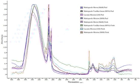 The band at 1369–1373 cm−1 arising from either the C-H bending vibrations of CH3 in carboxylic and amino acids, polysaccharides, and chlorophylls or the in-plane O-H bending vibrations in phenolic compounds [27,53] was found in all peel and flesh samples, with the flesh of the figs exhibiting a significantly (p < 0.05) higher intensity than the peels. Furthermore, no statistical difference was found between Markopoulo Vasilika Green and Markopoulo Mavra figs or between Mission figs from different regions, although the former exceeded the latter in terms of absorption intensity. Moreover, the flesh of Markopoulo Vasilika Green and Markopoulo Mavra figs was superior to the other flesh samples. The band at 1315 cm−1 was exclusively detected in fig peel samples and is related to O-H in-plane bending vibrations in flavonoids and phenolic acids [27,53]. The findings regarding the absorption of the ether group of carbohydrates and phenolics at 1246, 1143, 1100, 1074, 1056–1050, and 1028–1022 cm−1 [27,28] are of great interest. Specifically, absorption was only observed in the peel samples at the bands 1100 and 1074 cm−1, while the fig flesh exhibited multiple intensities compared to the peel at the band 1028–1022 cm−1. This result, combined with the high positive Spearman’s correlation (p < 0.05) between total soluble solids and the intensities at 1028–1022 cm−1 (rs = 0.7348), indicates the sweetness of fig flesh. The absorptions at 920 cm−1 (bending vibrations of glycosidic linkage), at 866 and 818 cm−1 (a-configuration anomeric vibration), and at 775 cm−1 (bending vibrations of ortho-substituted aromatic rings) [28,52] were only detected in the fig flesh samples, and in most cases, their intensities varied insignificantly. Therefore, these absorptions could be considered indicative of fig flesh. The band at 721 cm−1, which is associated with cis-C-H out-of-plane bending vibrations [28,52], could be attributed to phytochemicals such as coumarins and phenolic acids [22]. Finally, the bands at 630–623 and 518–514 cm−1, which are related to the out-of-plane O-H and to in-plane C-O-C bending of phenolic glucosides, respectively [28,52], were found in almost all peel and flesh samples, with a higher intensity observed in the latter. The ATR-FTIR spectral overlay of fig peels and flesh is presented in Figure 1.