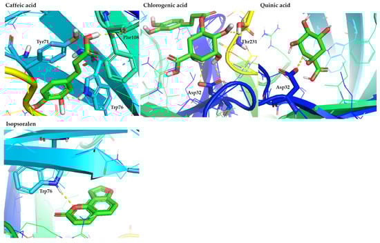Representative binding poses of the most promising phenolic acids (caffeic, chlorogenic, and quinic acids) and coumarins (isopsoralen), contained in figs, in the hBACE1 enzyme. The figure is made using the PyMOL Molecular Graphics System (version 3.0, Schrödinger, LLC, New York, NY, USA).