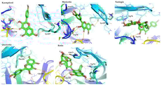Representative binding poses of the most promising flavonoids (kaempferol, myricetin, naringin, quercetin, and rutin), contained in figs, in the hBACE1 enzyme. The figure is made using the PyMOL Molecular Graphics System (version 3.0, Schrödinger, LLC, New York, NY, USA).