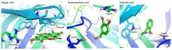 Among the hydroxybenzoic derivatives, ellagic acid showed one of the most complex interaction profiles, forming hydrogen bonds with Trp76, Arg128, and Phe108, in addition to π–π stacking with Tyr71. Its rigid, polycyclic structure appears to facilitate multi-residue recognition. Protocatechuic and salicylic acids formed simpler interactions—primarily with Asp32 and residues near the flap entry—but still scored within the promising range, consistent with their strong polarity and capacity for hydrogen bonding [62].
