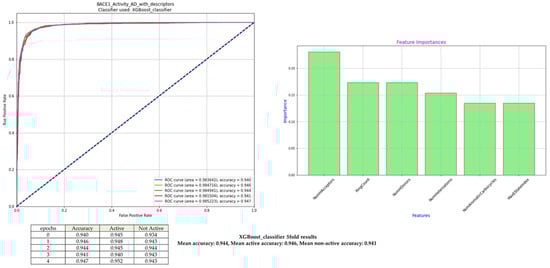 Classification performance of XGBoost for BACE1 inhibition. Receiver Operative Curves (ROCs) associated with each of the five training epochs with persistent Area Under Curve (AUC) values attest to the excellent model performance, and the ROC curves reveal the model’s excellent discriminatory capability. Out of the six selected molecular descriptors, the feature-importance profile highlights NumHAcceptors, RingCount, and NumHDonors as the most impactful contributors to model performance.