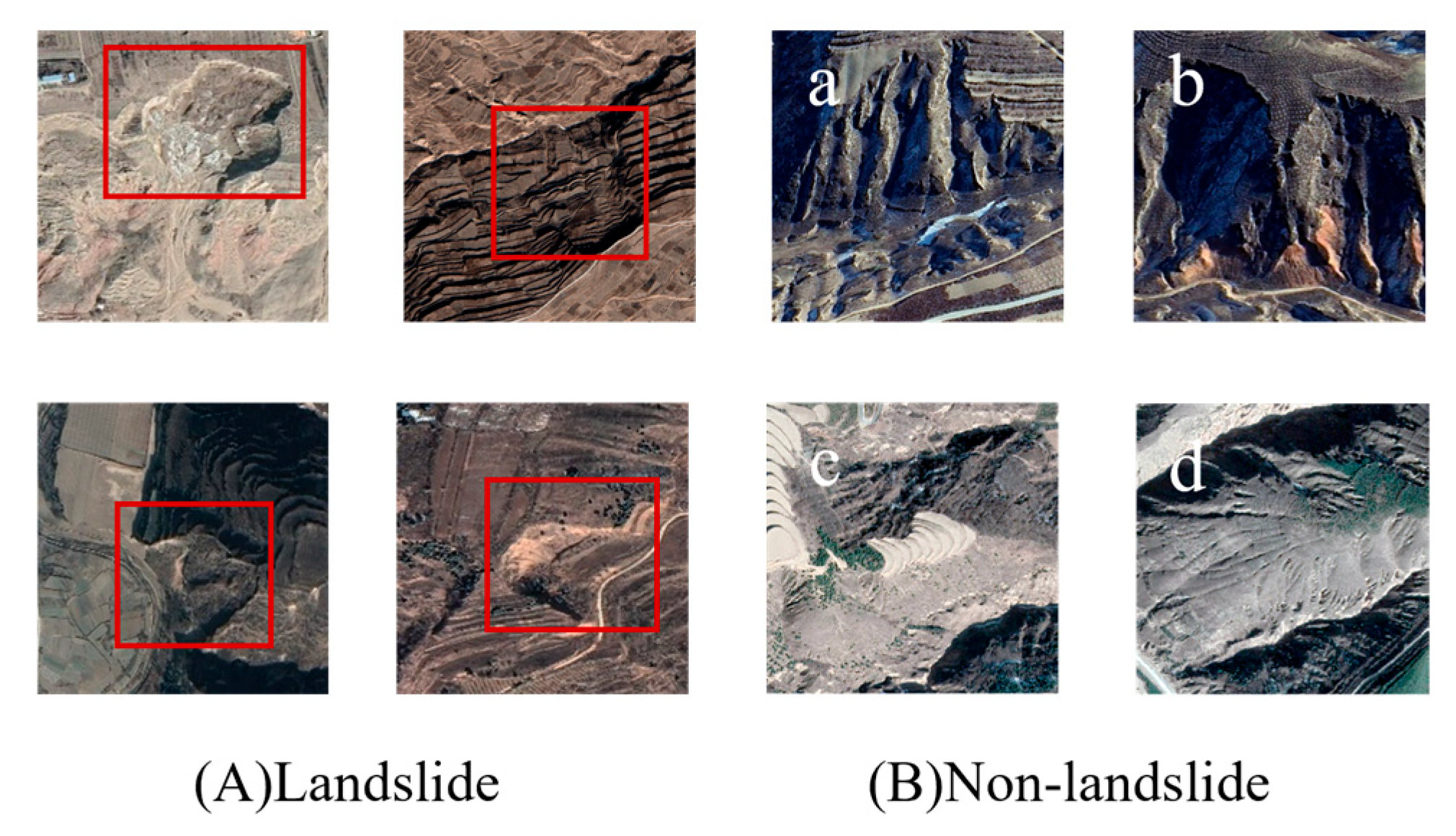Owing to long-term fluvial erosion in the Loess Plateau region, extensive gully landforms and steep slopes have developed. These landforms exhibit optical characteristics similar to those of landslides, which can easily lead to misclassification and reduced detection accuracy. Therefore, to enhance the model’s ability to discriminate between landslides and non-landslide features, typical non-landslide samples, such as eroded gullies and slope-foot deposits, were deliberately included in the dataset to strengthen the model’s discrimination capability for morphologically similar landforms, as shown in