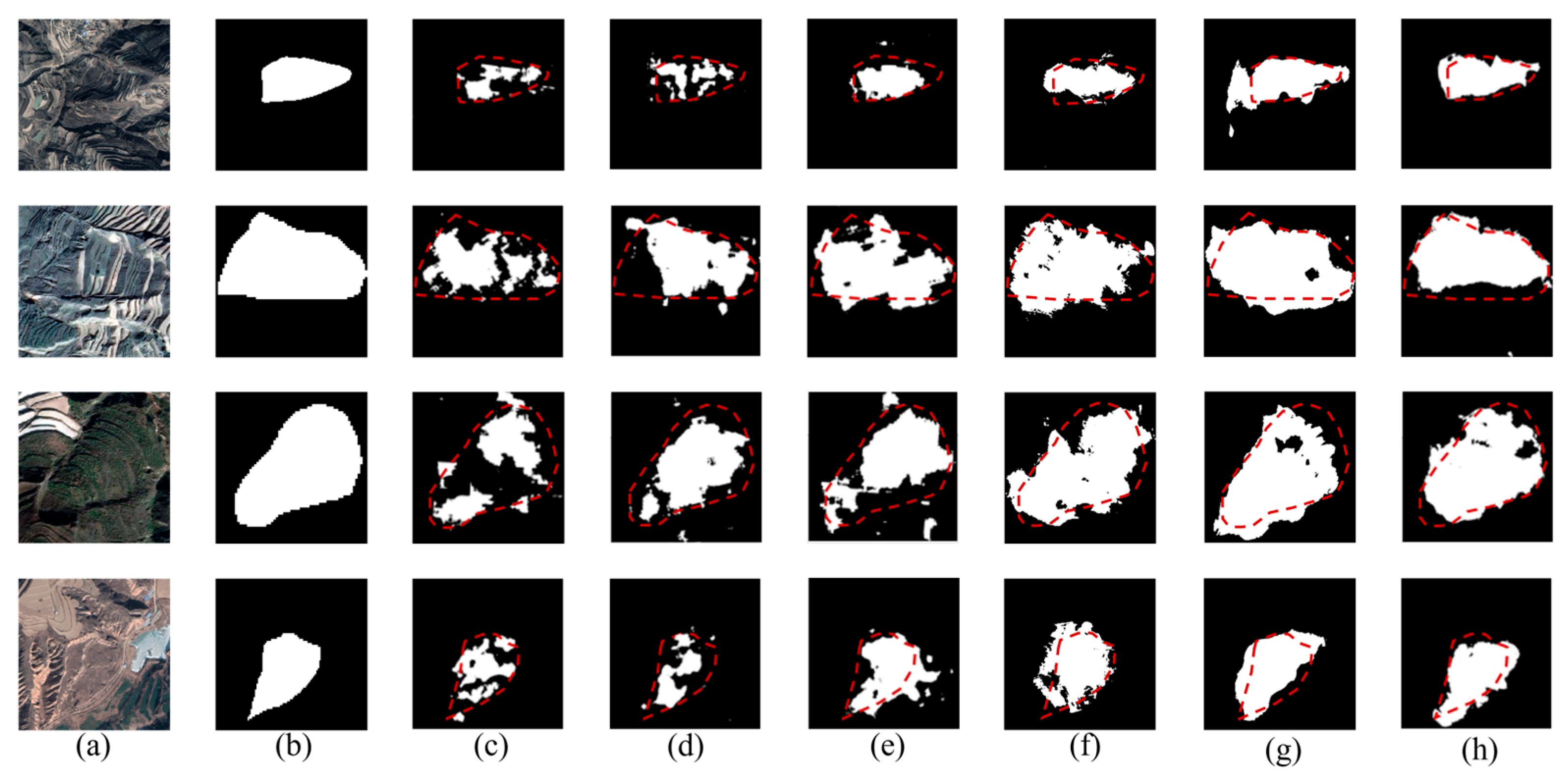 Table 10 presents a comparative analysis of performance differences across landslide types. The results indicate that models trained independently on widening and rectangular landslide datasets outperform those trained on the joint dataset across four evaluation metrics. Specifically, the F1-score increases by 2 percentage points for widening-type landslides and by 6 percentage points for rectangular landslides.
