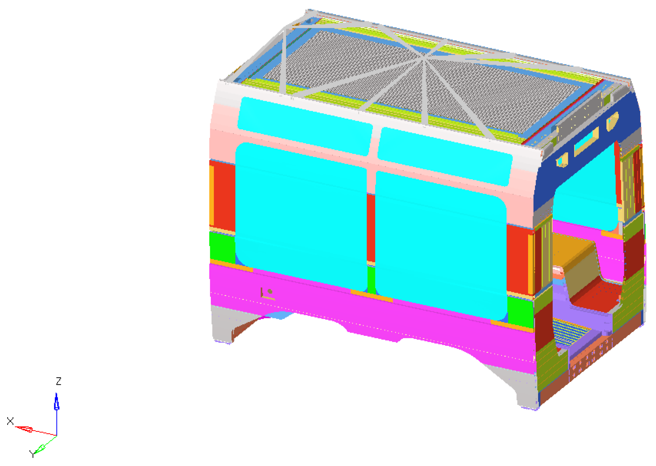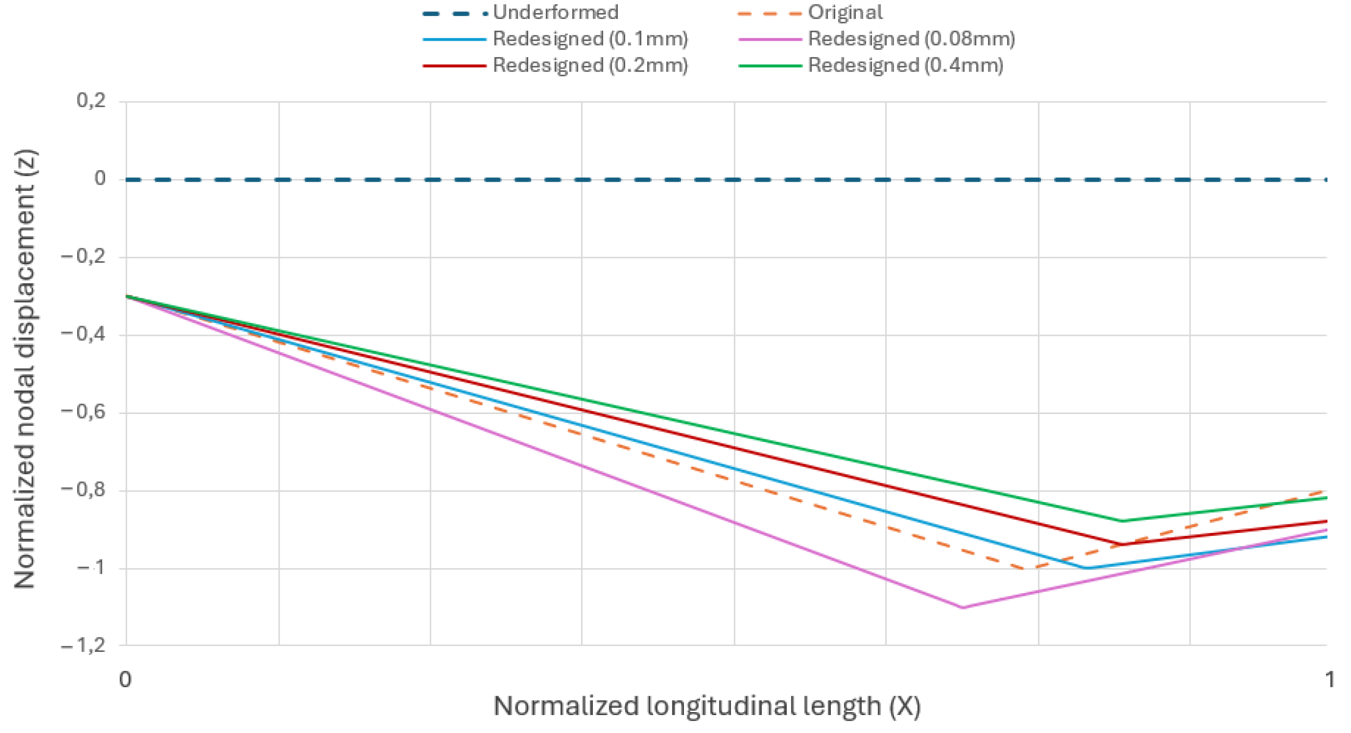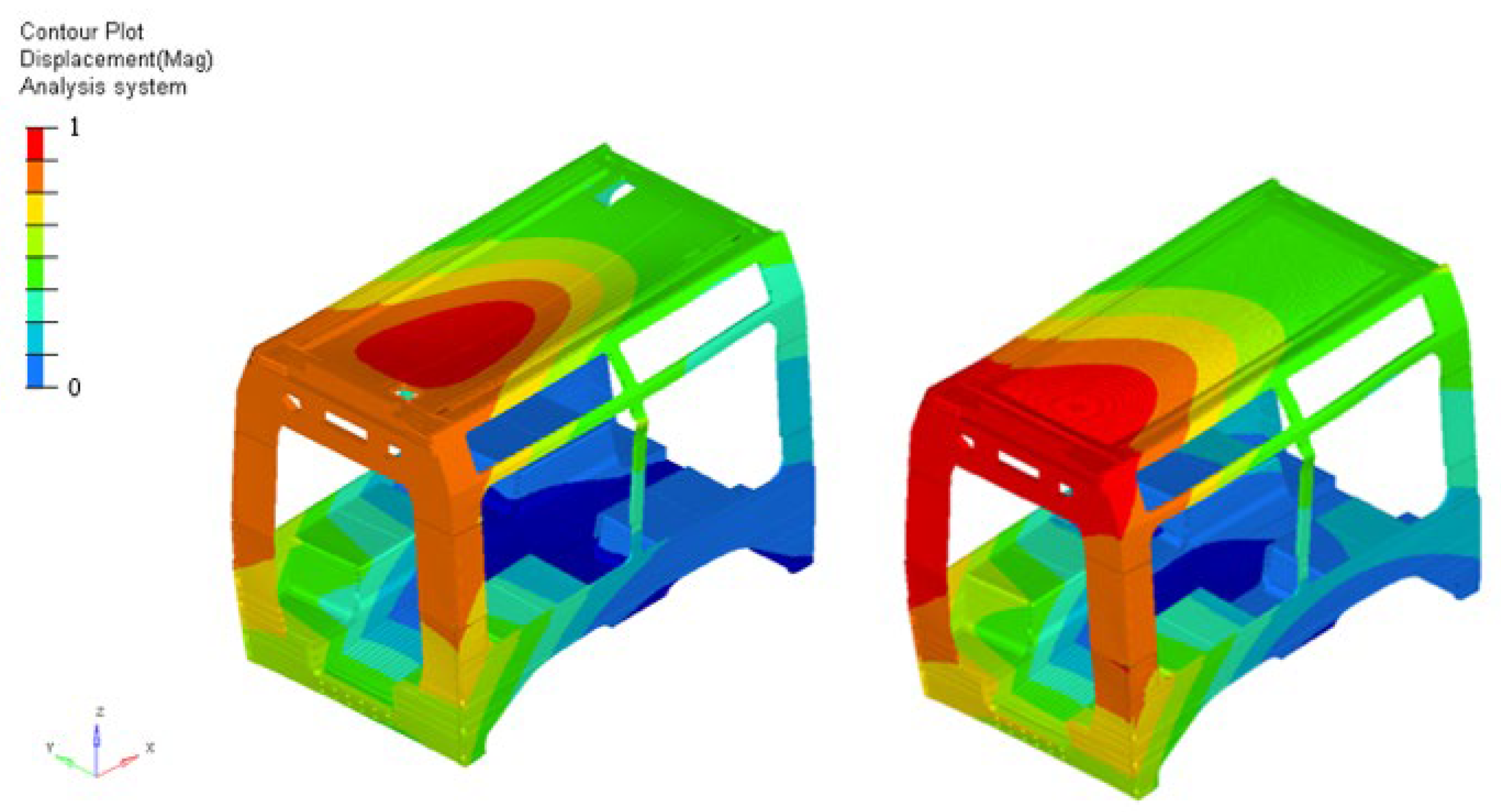 - The static analysis, performed under the most critical load case, confirmed the structural reliability of the redesigned carbody. The global deformation magnitude was comparable to that of the reference configuration, while the new design exhibited a more uniform and compact displacement pattern. The maximum stress increased by about 19% but remained within safe limits, with a utilization factor of approximately 0.96;