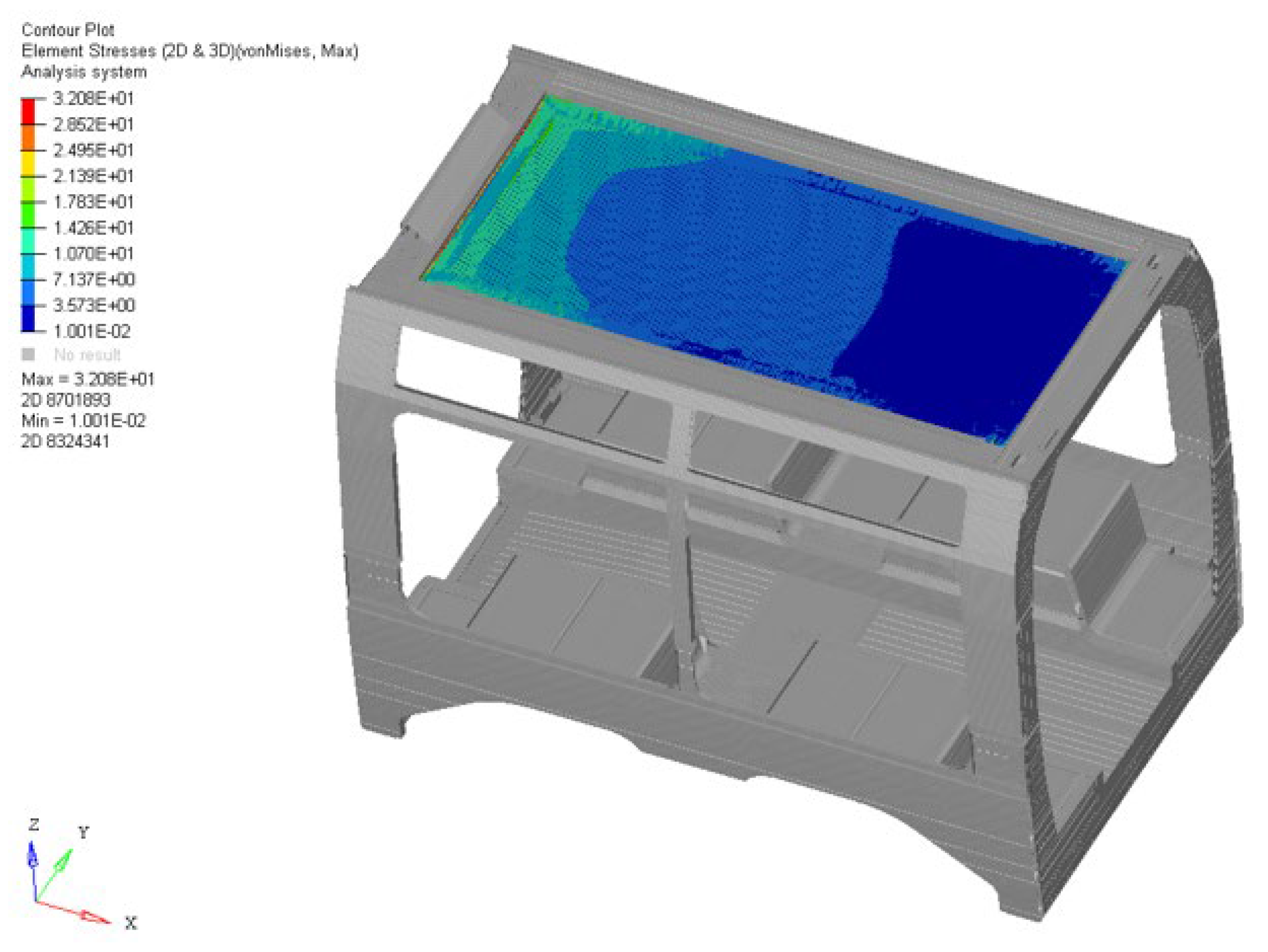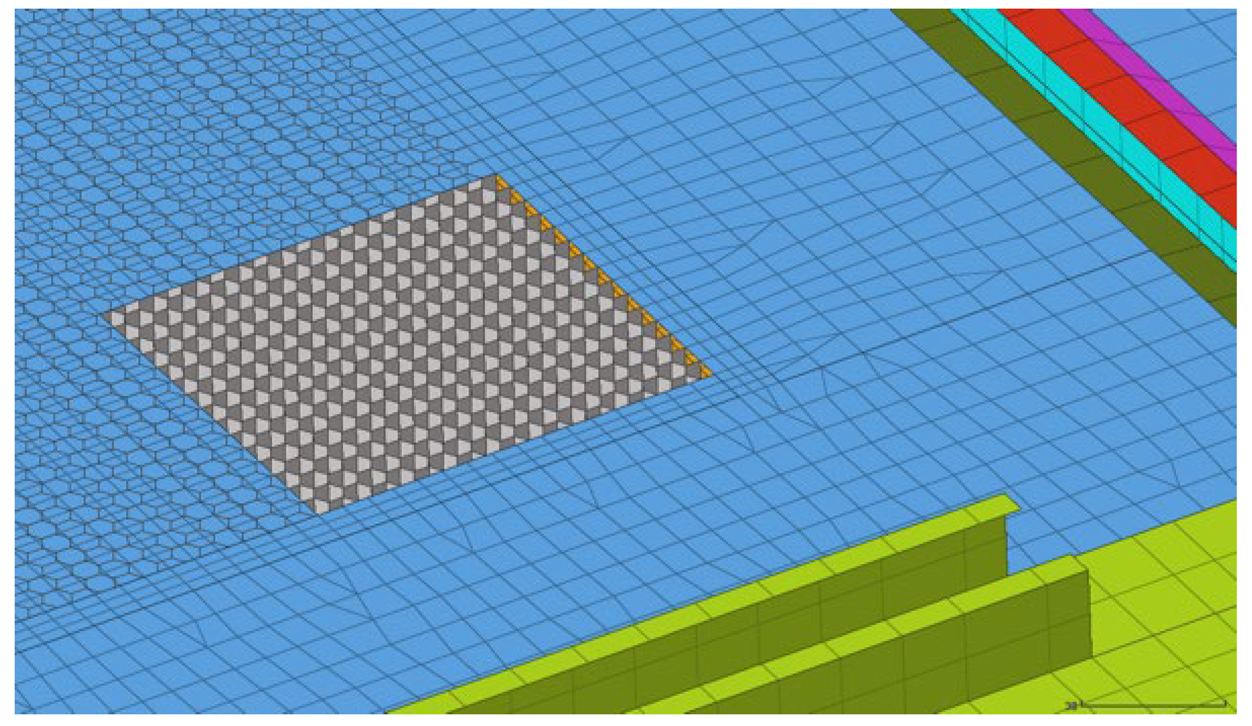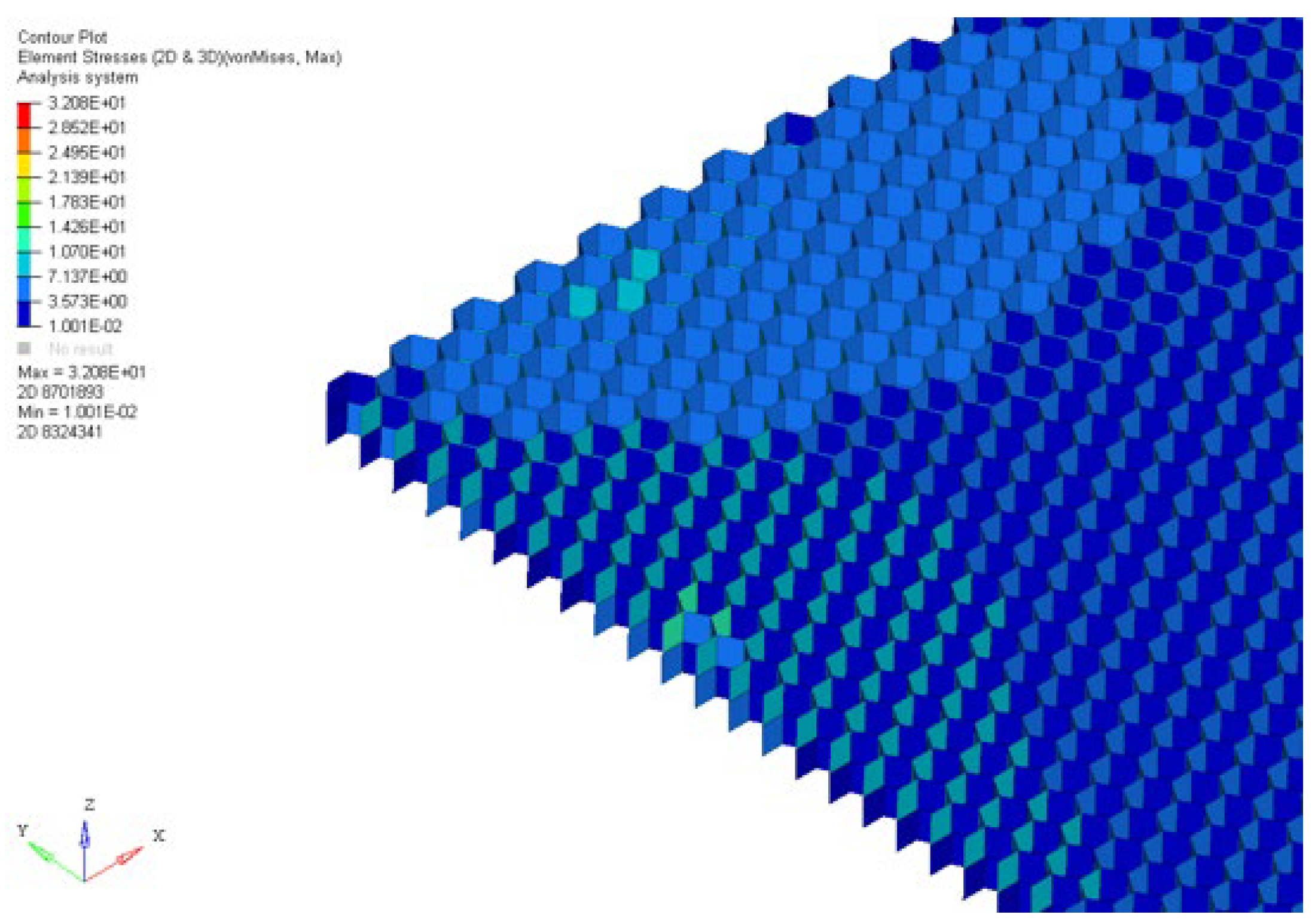 - The sandwich panel showed acceptable stress levels, with localized concentrations at the bonded joint zone and a generally uniform distribution within the honeycomb core;