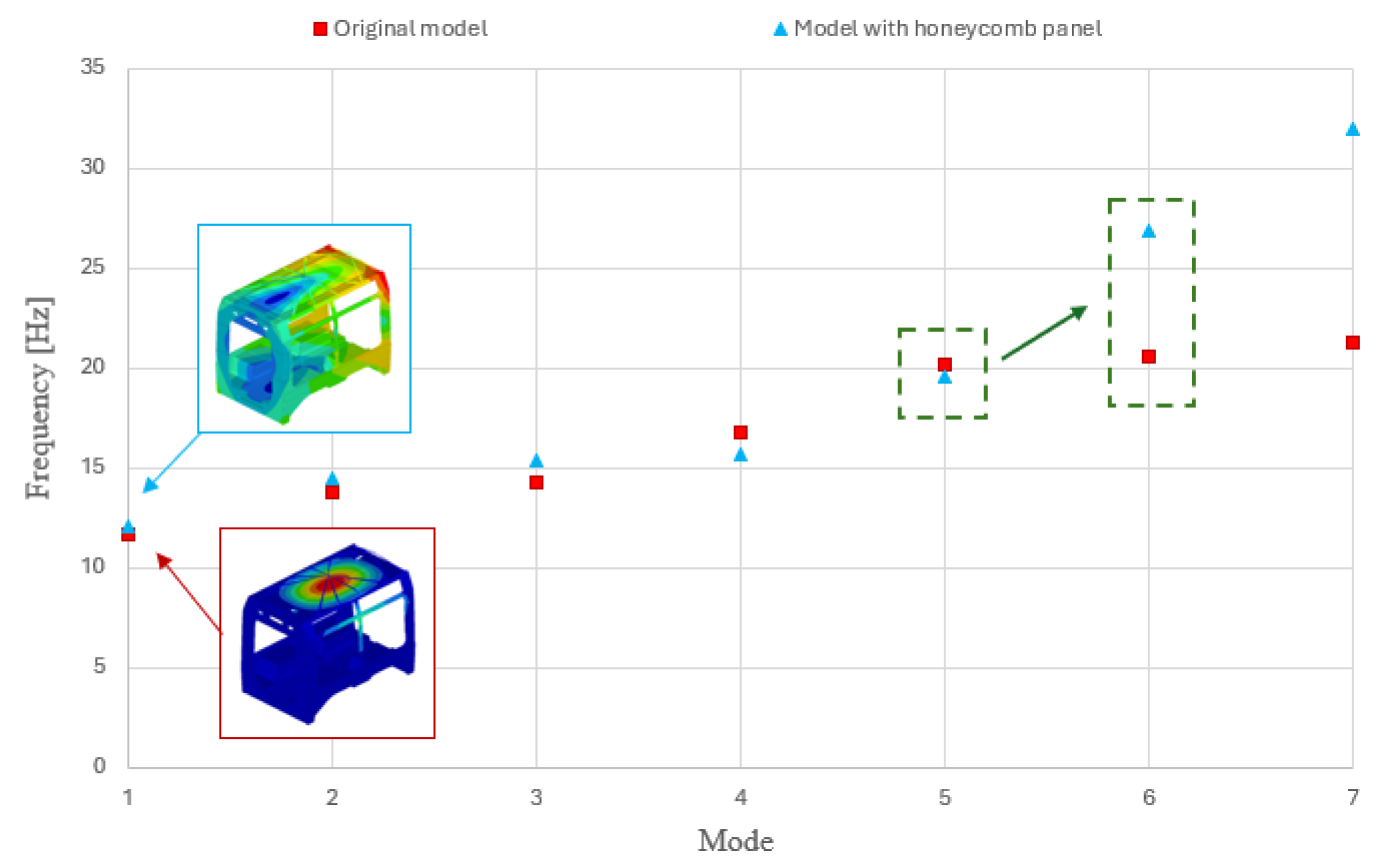| Mode | Original Model | Model with Sandwich Panel | Δ Frequency |