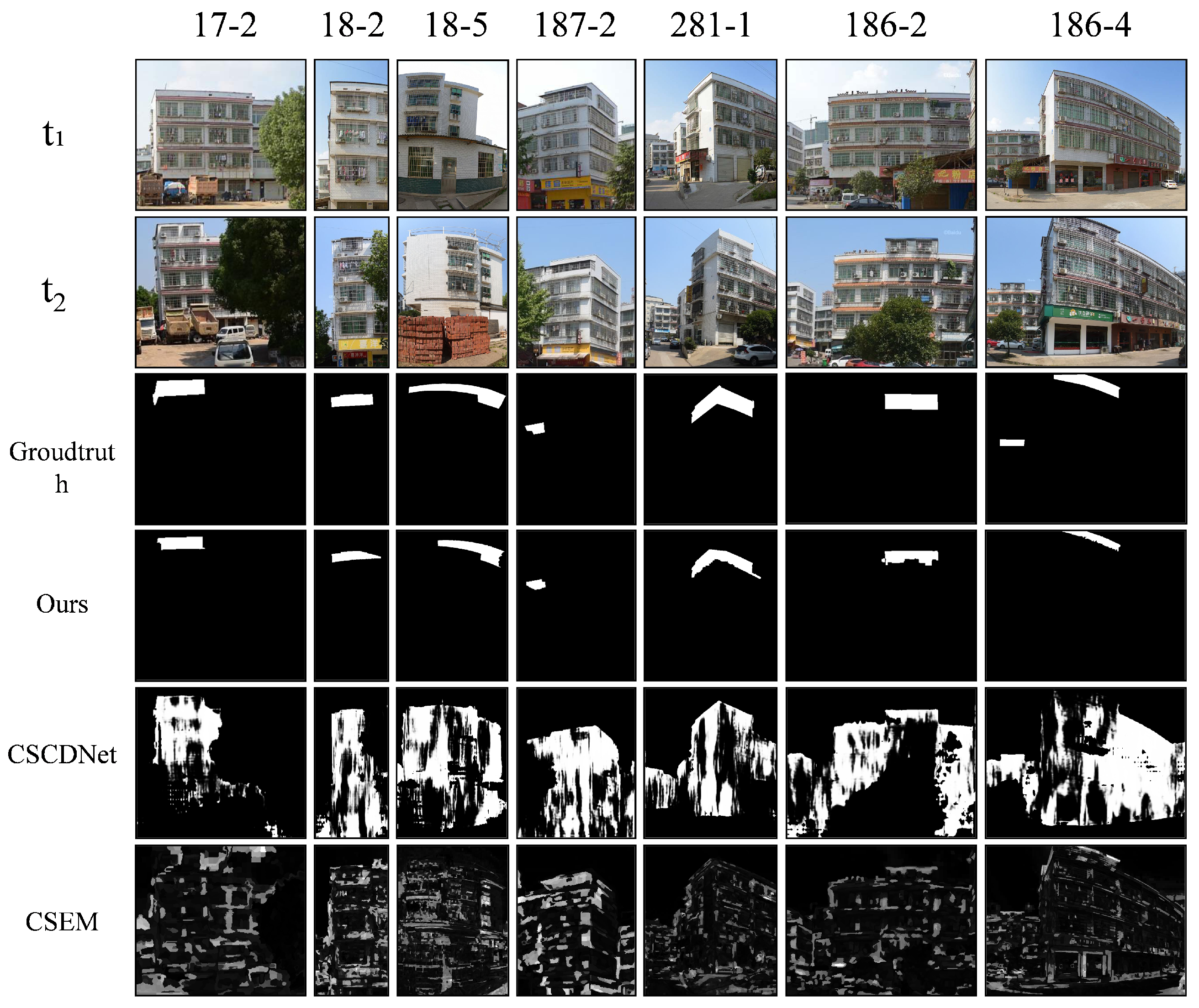 It is challenging to calculate the overall accuracy directly. This is because the CSCDNet and SCEM algorithms generate a substantial number of fragmented regions during the detection process. Therefore, this study assesses the alignment between the change areas detected by different methods and the actual change areas. The evaluation focuses on spatial position consistency, providing a comprehensive assessment of both accuracy and completeness.