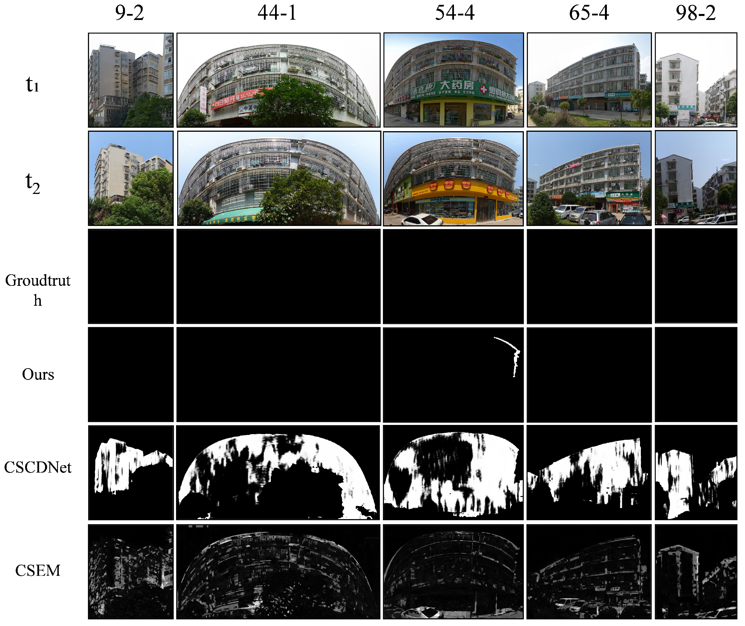 In multi-temporal street-view image change detection, sampling errors and differences in imaging devices can lead to registration deviations between images, increasing the difficulty of detection. The proposed method focuses on changes in building outlines, effectively avoiding interference from factors such as lighting, color, and other ground objects. Even under imperfect registration conditions, it maintains high detection accuracy and stability. CSCDNet is more sensitive to brightness variations, often misclassifying unchanged regions as changes, which limits its generalization ability. Although SCEM can filter out interference from the sky and vegetation, it struggles with building details or brightness changes. As a result, it is prone to false detections and fragmented detection outputs.