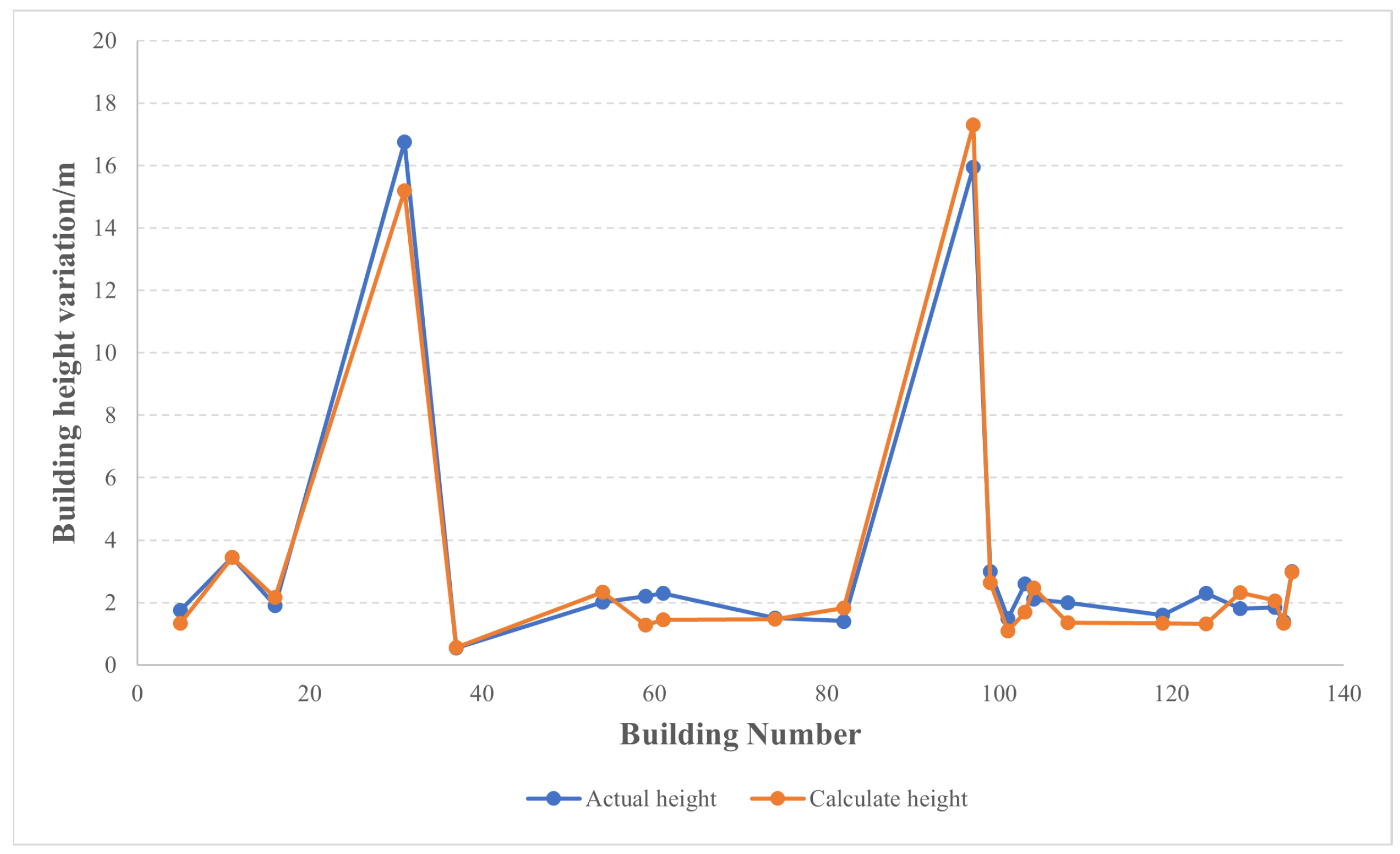 To verify the accuracy of the HCAOT algorithm in calculating changes in building height, its estimated results were compared with field measurements. As shown in