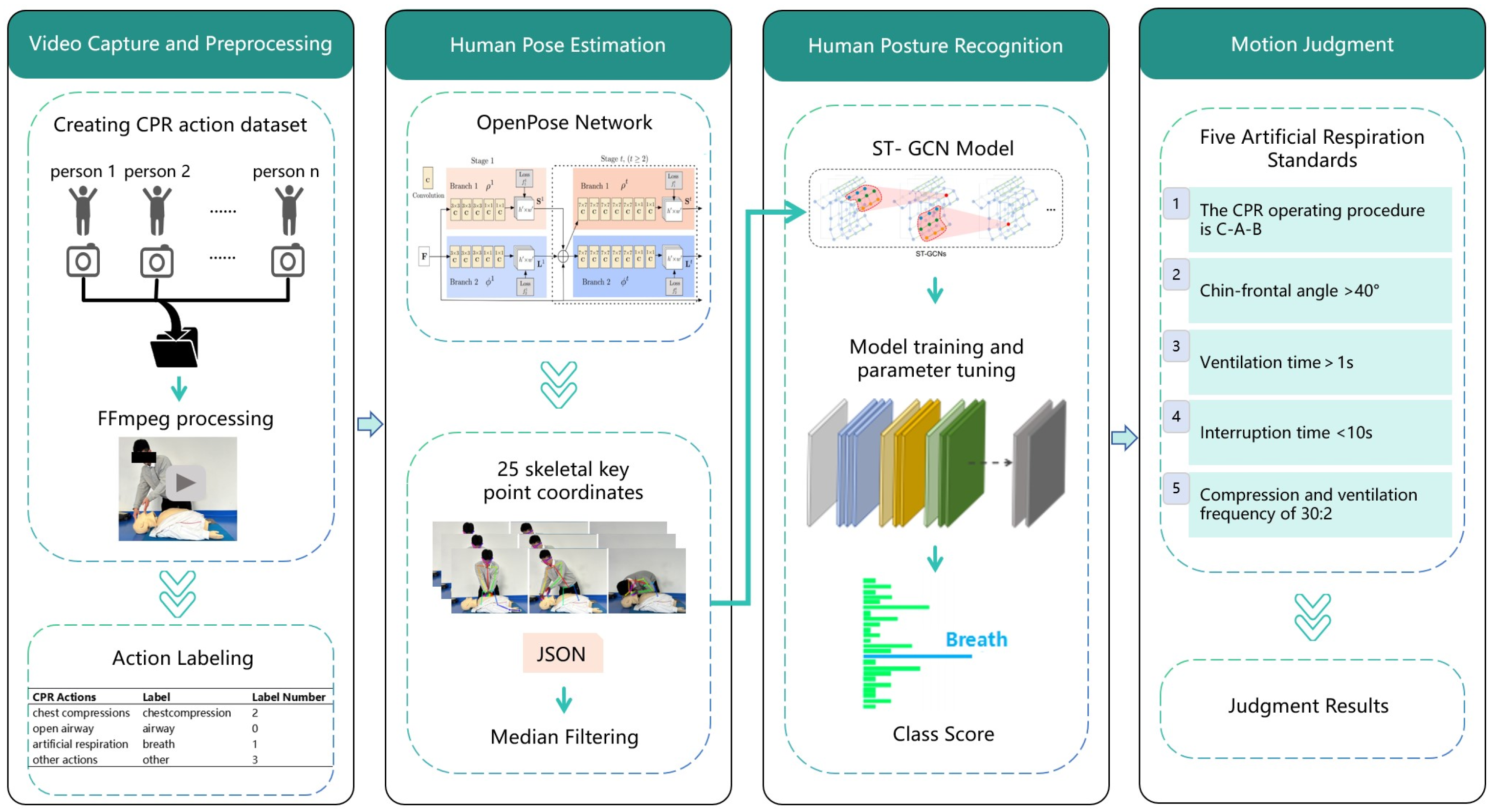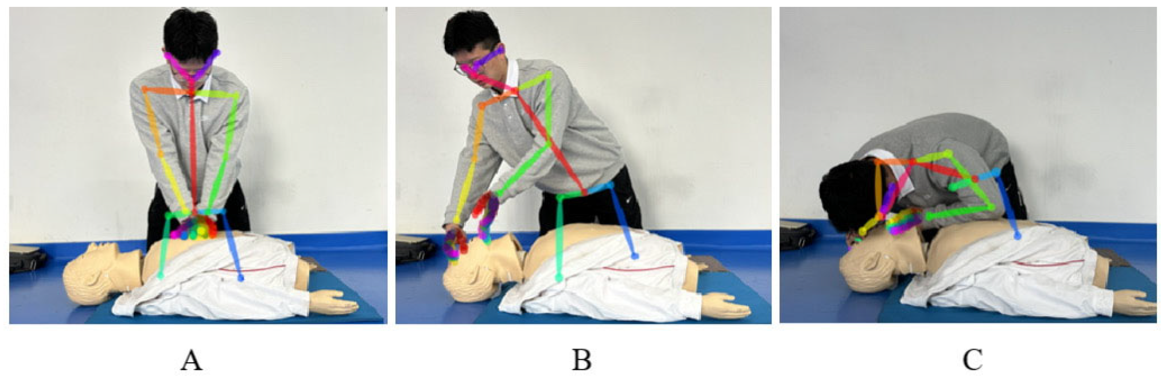 In this study, we independently developed and established a CPR action database, implemented the deep learning-based OpenPose (version 1.7.0) algorithm to estimate the coordinates of two-dimensional (2D) key human body points accurately, and then constructed an ST-GCN framework for action feature extraction and pattern recognition. This technical approach enables a systematic evaluation of the temporal logic accuracy of CPR procedures and facilitates the quantitative analysis of key parameters, such as the degree of airway opening and ventilation duration during artificial respiration. Ultimately, this work aims to develop a CPR quality assessment system based on multimodal data fusion. As shown in