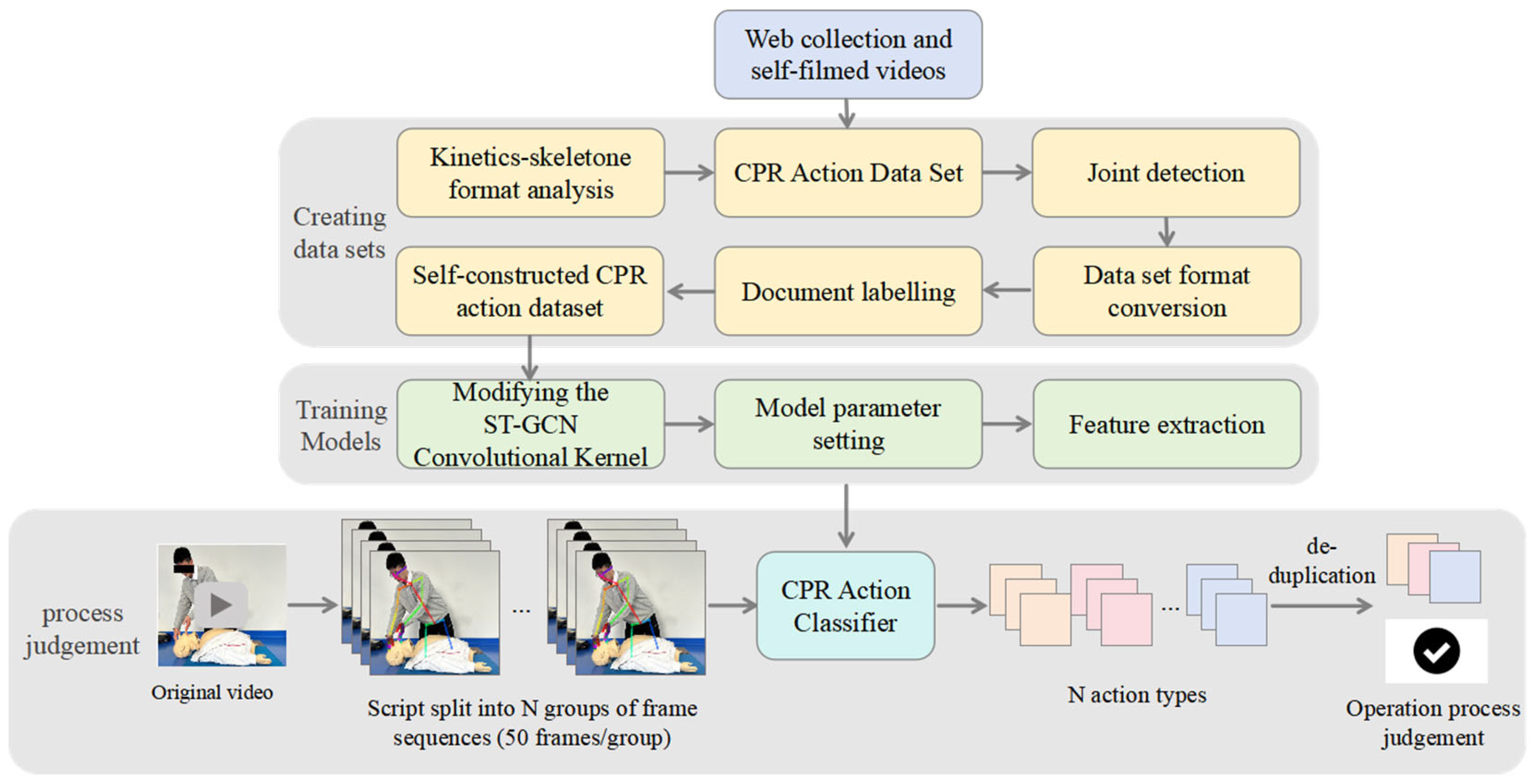 Figure 3 shows the judgment algorithm for the CPR process consists of three key stages: dataset construction, action classification model training, and procedural evaluation.