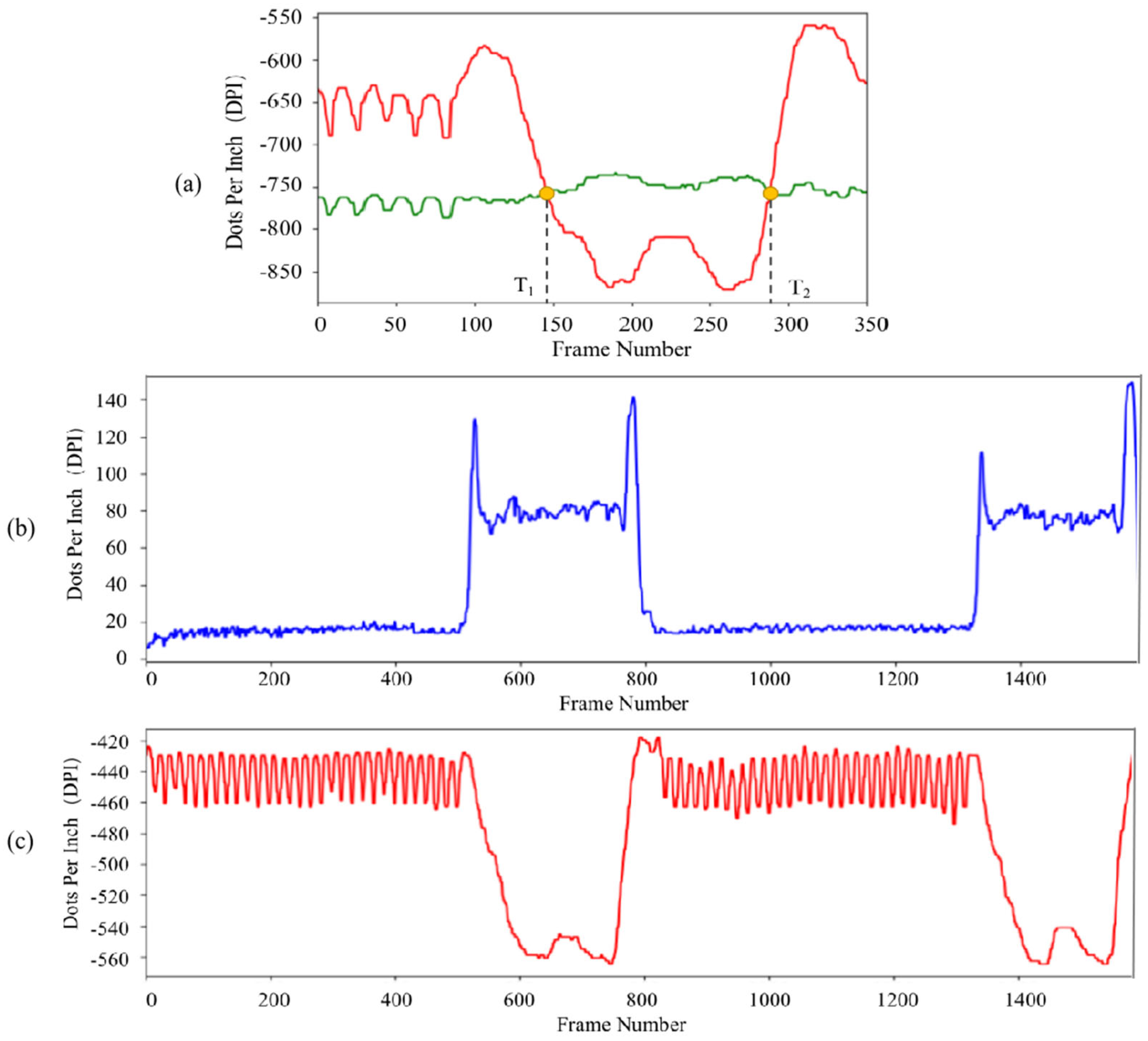 Figure 6a. The horizontal coordinates of the two intersection points between these time series curves represent the start (T1) and end (T2) times of the mouth-to-mouth ventilation cycle. The first intersection point (T1) serves as a checkpoint for verifying whether the airway is adequately opened at that frame.