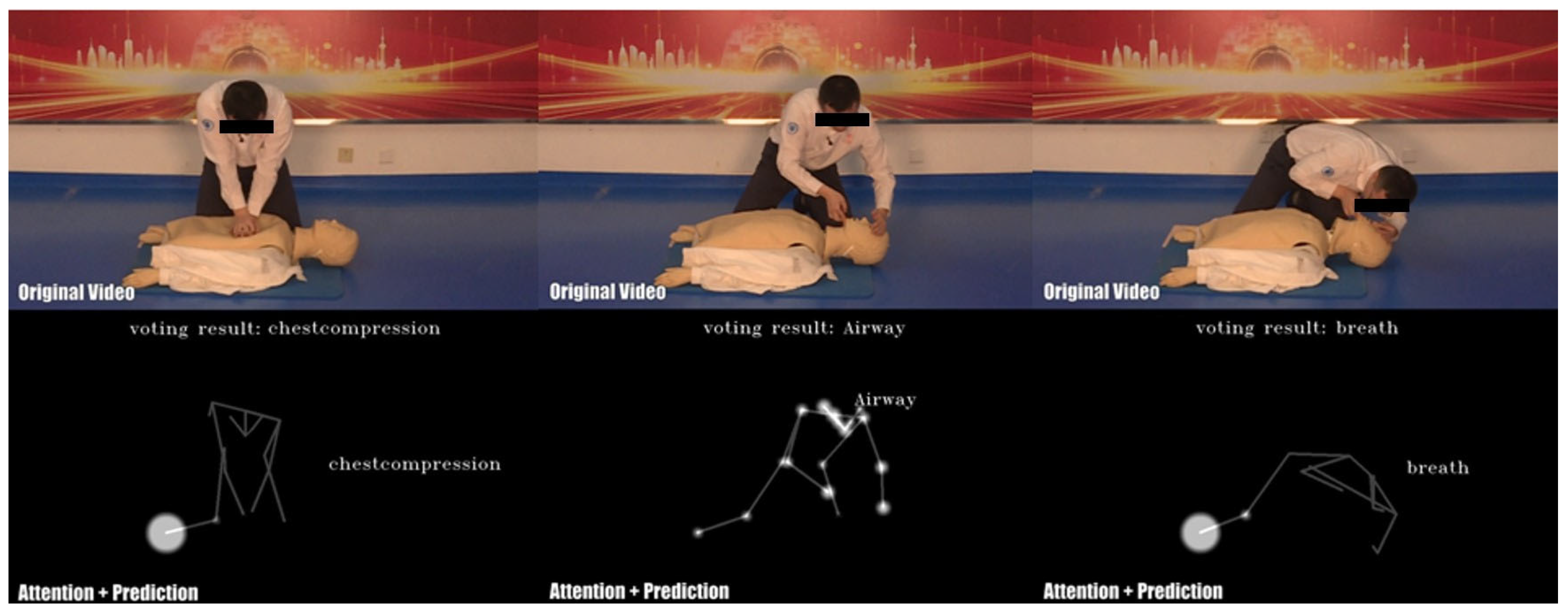 18] and empirical biomechanical analysis, five quantitative metrics for artificial respiration are defined and implemented: CPR operation procedure, chin–frontal angle, interruption time, ventilation time, and ventilation frequency. Third, a dedicated CPR action dataset comprising multi-source videos is constructed and publicly released, and system performance is validated. Experimental results demonstrate that the proposed framework performs effectively in both action recognition and standardized assessment of ventilation quality.