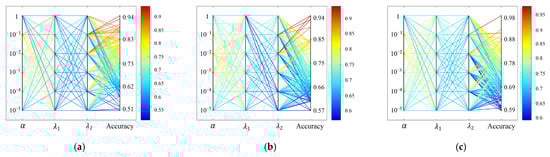 For the kernelization step, a Gaussian kernel was utilized. Its scale factor, defined as , was determined through experimental tuning and subsequently set to 0.8. Additionally, there are four important parameters that should be determined for the proposed method, i.e., balance parameters , and , and the number of dimensions. These parameters can be determined by cross-validation experiments. , and control the effects of sparsity, weight of local structural, and inter-class semantic information in the objective function, respectively, which are tuned together and selected from {10−5, 10−4, 10−3, 10−2, 10−1, 1}. The corresponding experimental results of the HSI datasets are shown in Figure 1. It can be seen that the overall accuracy (OA) can reach the maximum values with some values of , and , which are common for the three experimental datasets. Accordingly, setting the values of , and as (0.01, 0.1, 0.1) is acceptable for all the datasets.