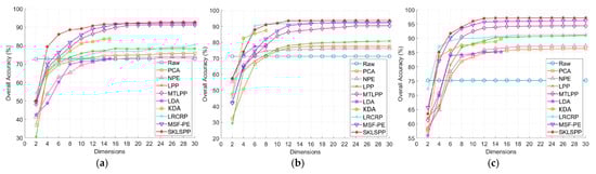 Figure 2 illustrates the changes in OA corresponding to the retained number of dimensions (2, 4, 6, 8, 10, 12, 14, 16, 18, 20, 22, 24, 26, 28, and 30). For comparison, the classification results of the original image and the PCA, NPE, LPP, LDA, KLDA, LRCRP, MFS-PE, and SKLSPP dimension-reduced results were also generated. Across all methods and datasets, the classification accuracy stabilizes when the number of dimensions exceeds a certain threshold. Therefore, 14, 12, and 12 dimensions are reasonable values for the proposed SKLSPP methods for the three datasets in subsequent classifications. In particular, since the rank of the between-class scatter matrix is (where is the number of classes), the dimensionality of LDA- and KDA-transformed data is up to . Thus, the dimensionality of LDA and KDA is set to 15, 8, and 14 for the three test datasets. Finally, the extracted features from each method were used as input to a multiclass SVM classifier. A Gaussian kernel was employed for SVM, and the regularization and kernel parameters were optimized through cross-validation.