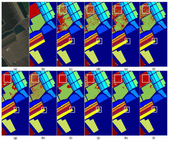Classification maps for the Salinas dataset using different DR methods. (a) Hyperspectral image. (b) Ground truth. (c) Raw spectral. (d) PCA. (e) NPE. (f) LPP. (g) MTLPP. (h) LDA. (i) KDA. (j) LRCRP. (k) MFS-PE. (l) SKLSPP.