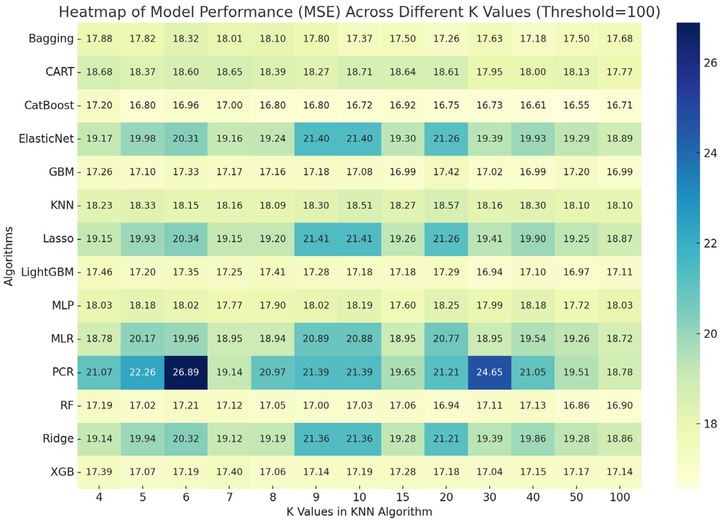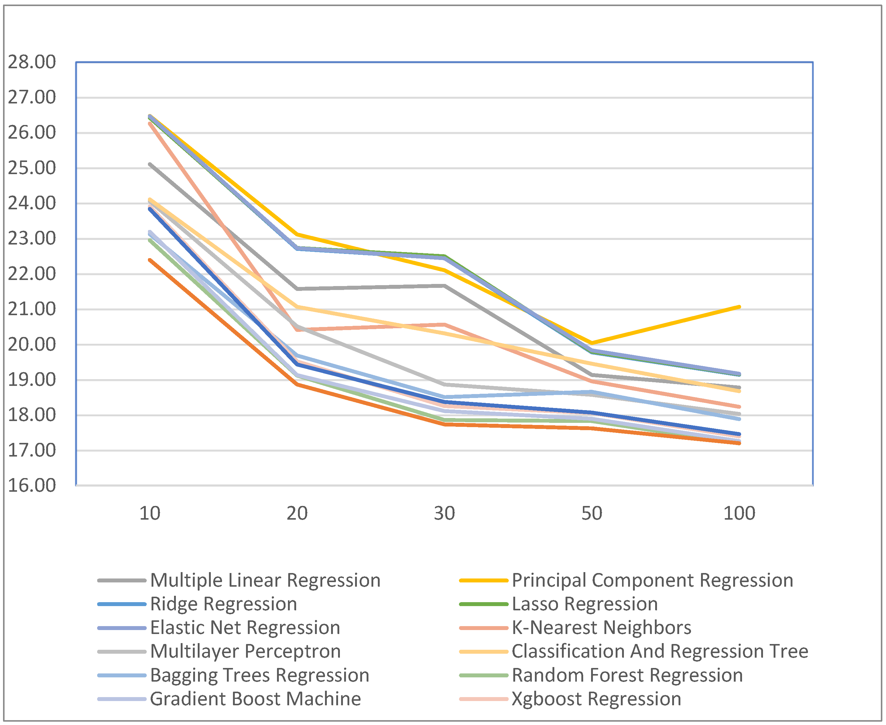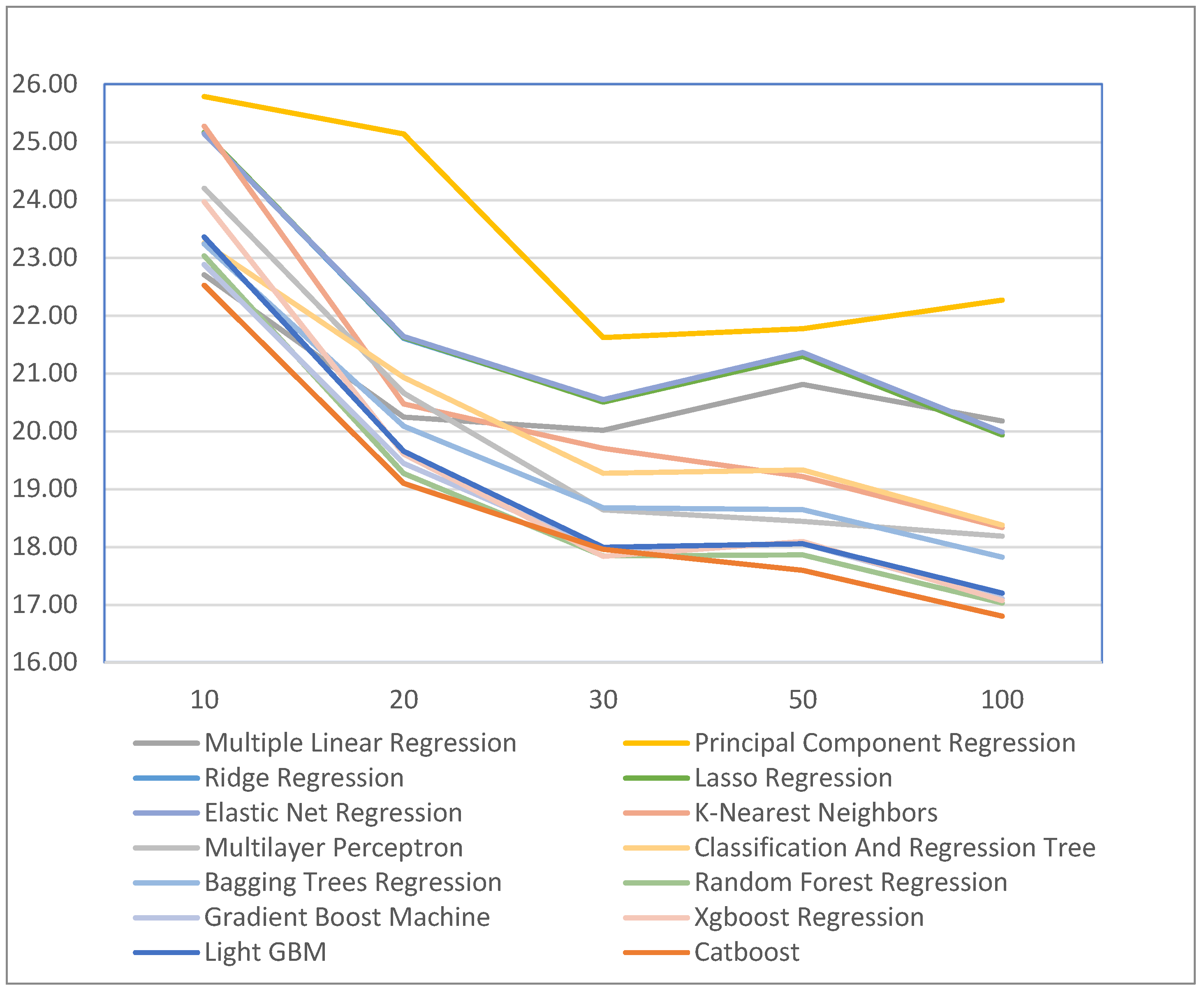 | K Values | Threshold Value | Multiple Linear Regression | Principal Component Regression | Ridge Regression | Lasso Regression | Elastic Net Regression | K-Nearest Neighbors | Multilayer Perceptron | Classification and Regression Tree | Bagging Trees Regression | Random Forest Regression | Gradient Boost Machine | Xgboost Regression | Light GBM | Catboost |