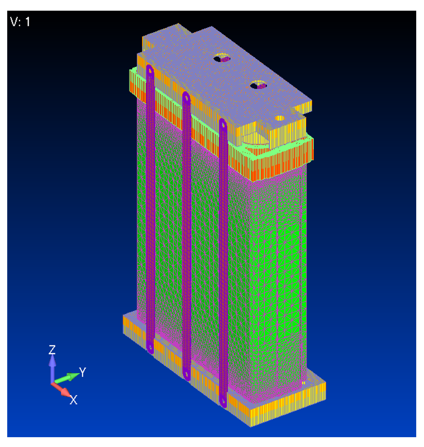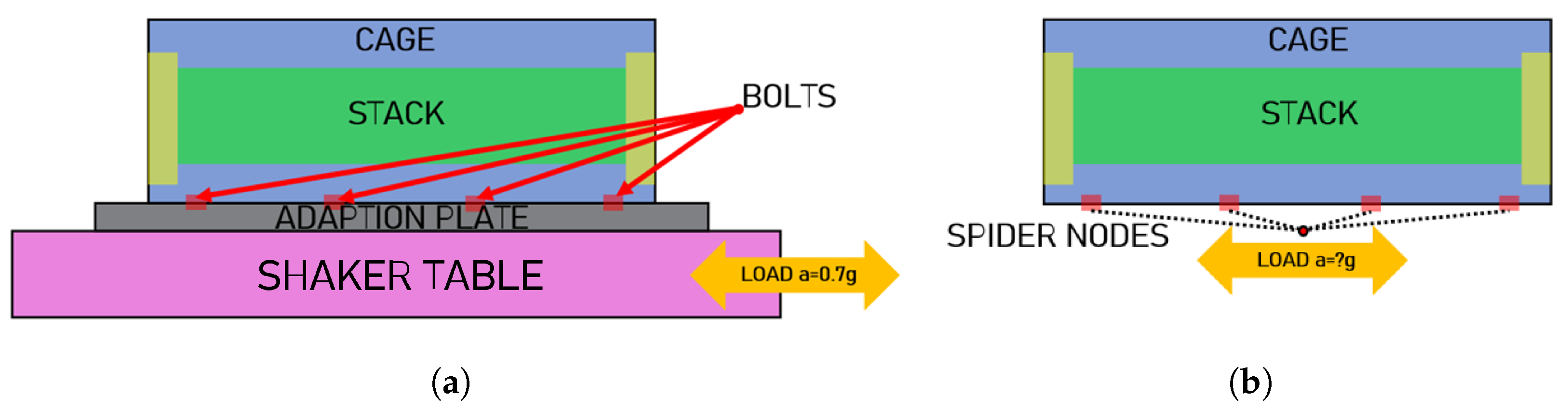 It is important to note that all dynamic simulations in this work are based on a linearized representation of the stack. In addition to the compression bands and disc springs, which are explicitly linearized through a fictitious modulus and a tangent stiffness at the nominal preload, other components and interfaces (e.g., the cell package, gasket contacts and bolted joints) may also exhibit amplitude-dependent behavior. The material and stiffness parameters used in the FE model were tuned using modal data obtained at specific excitation levels, so that the resulting properties are strictly valid in a neighborhood of these operating conditions. For substantially different load amplitudes, both under sinusoidal excitation and under shock pulses, some deviation from purely linear behavior is expected, for instance in the form of modest frequency shifts or changes in effective damping. The preliminary immunity results presented in the following should therefore be interpreted as quasi-linear predictions, which are appropriate for assessing relative trends and critical locations but do not capture all possible non-linear effects at extreme load levels.