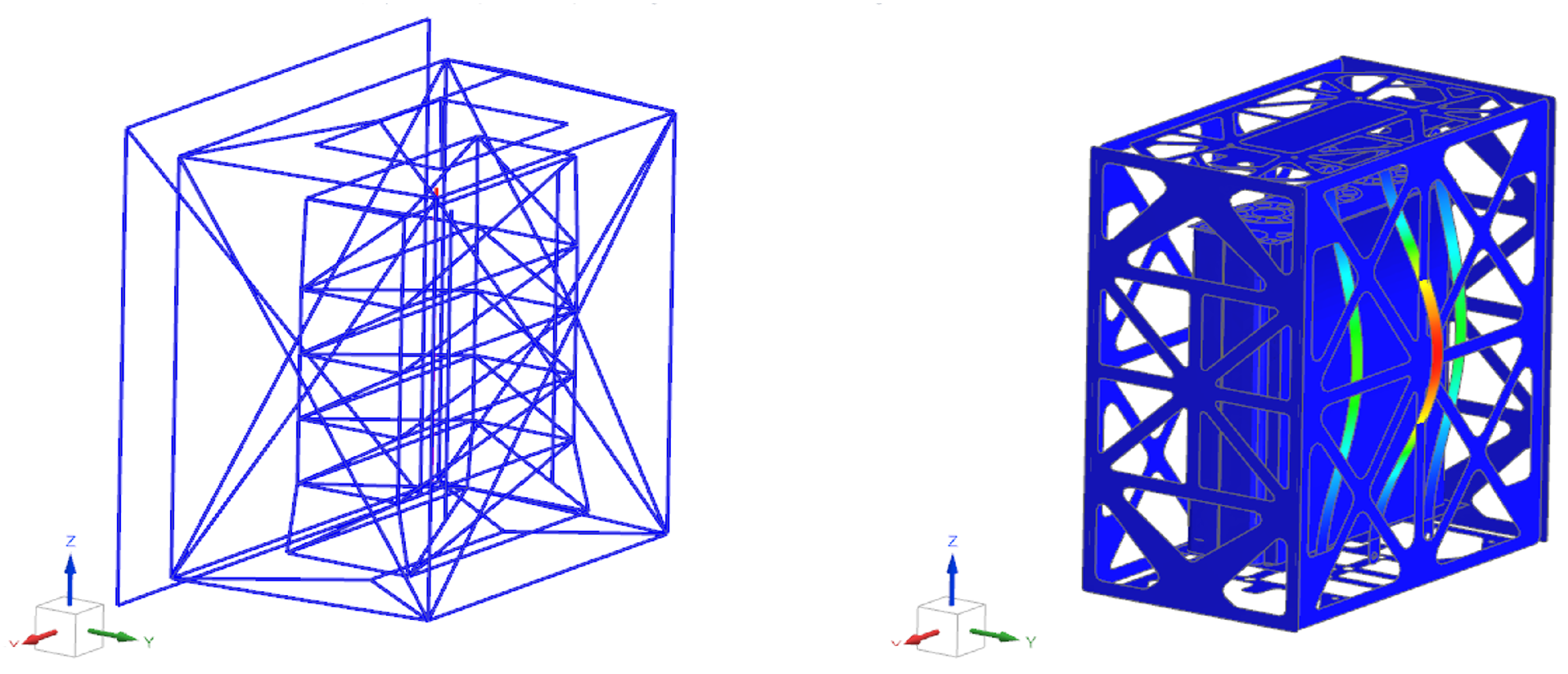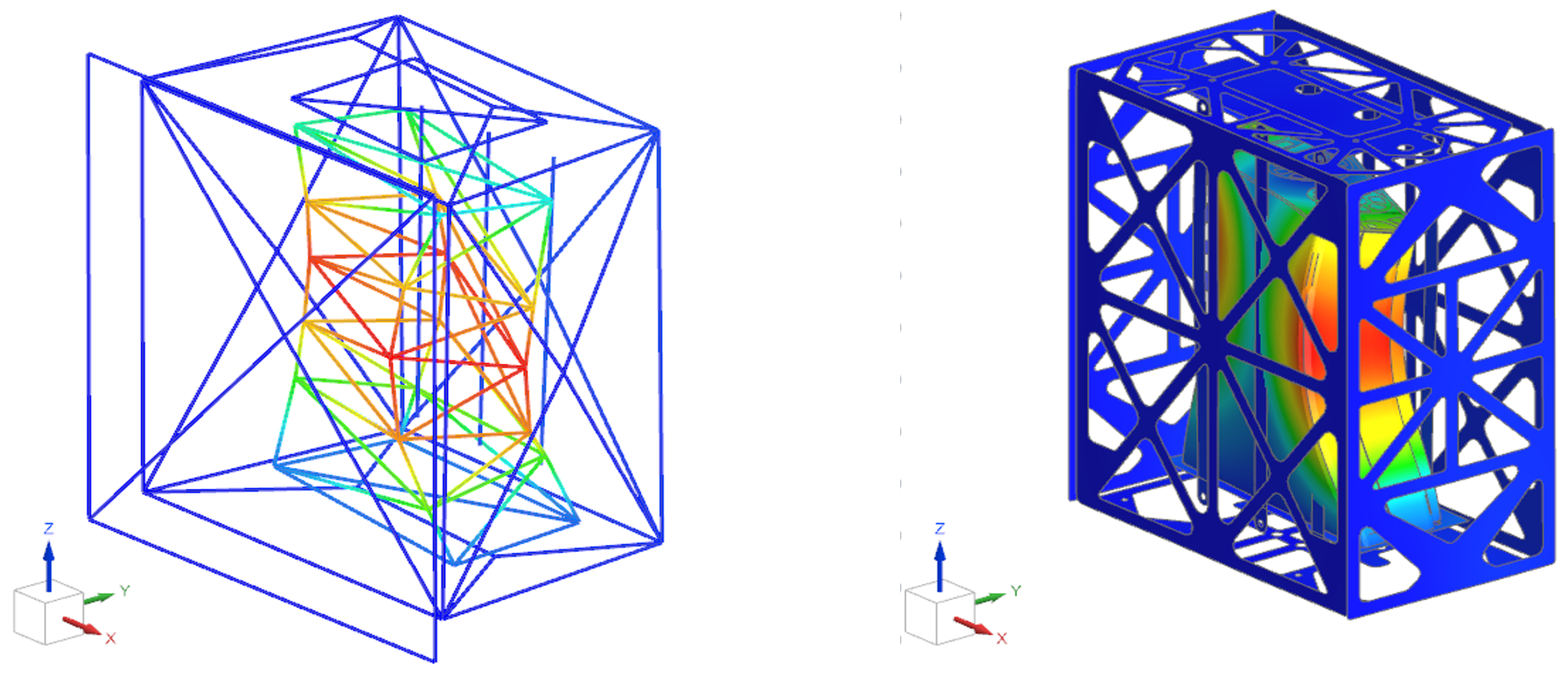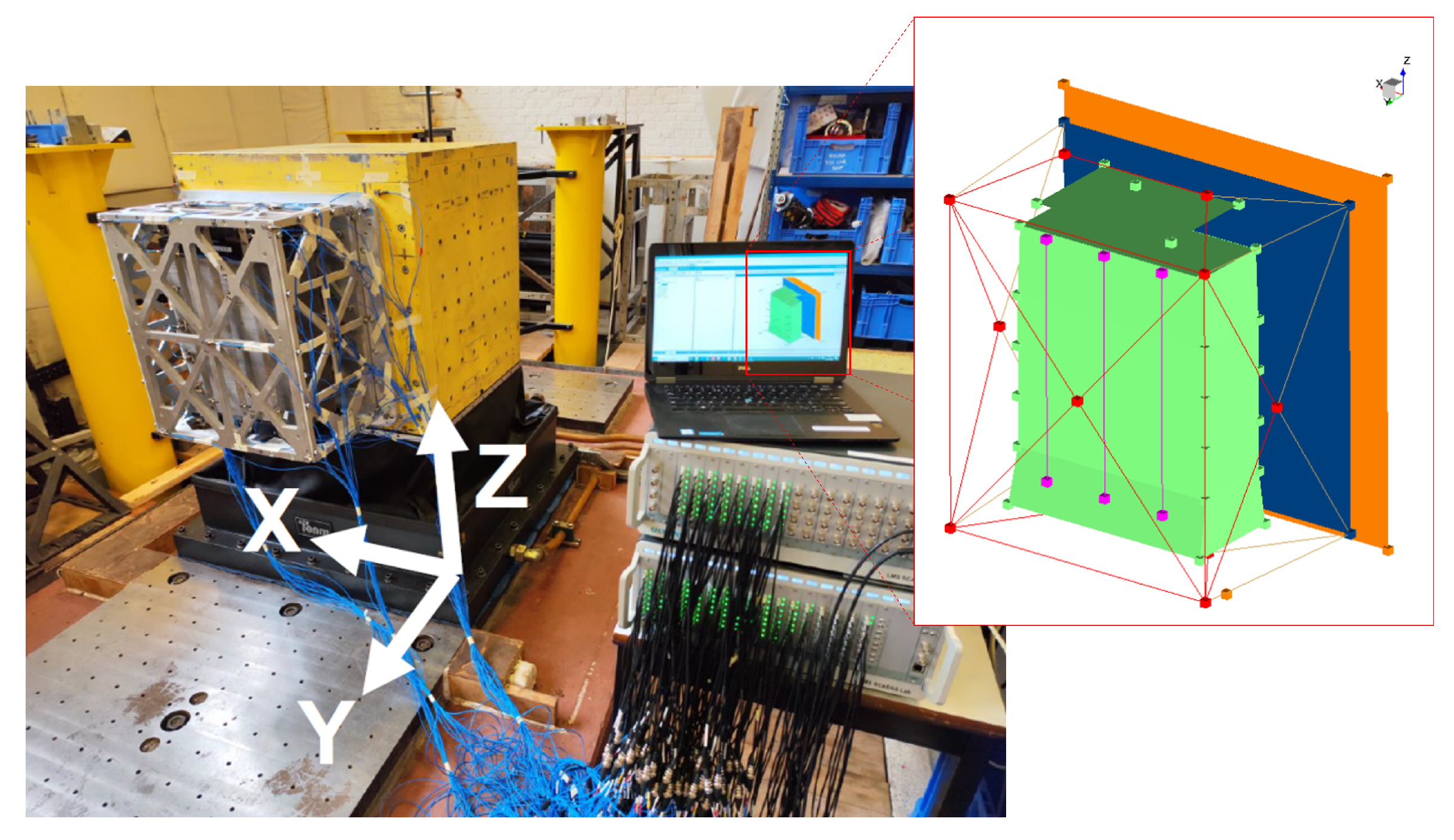 During the experimental campaign, a harmonic base excitation of 0.7 g was applied over the 10–300 Hz bandwidth, sequentially in the x, y and z directions. A control accelerometer mounted on the cube shaker table ensured that the desired input was accurately reproduced in the analyzed direction. The tuning of the FE model natural frequencies relied exclusively on the open-loop pseudo-random excitation run in the z direction, whereas the sine sweep tests in all three directions provide the comparison dataset discussed in the following. This choice allows residual numerical–experimental discrepancies to be more clearly attributed to unmodelled nonlinearities (e.g., bolted joints and contact interfaces) and to limitations in the representation of the test boundary conditions.