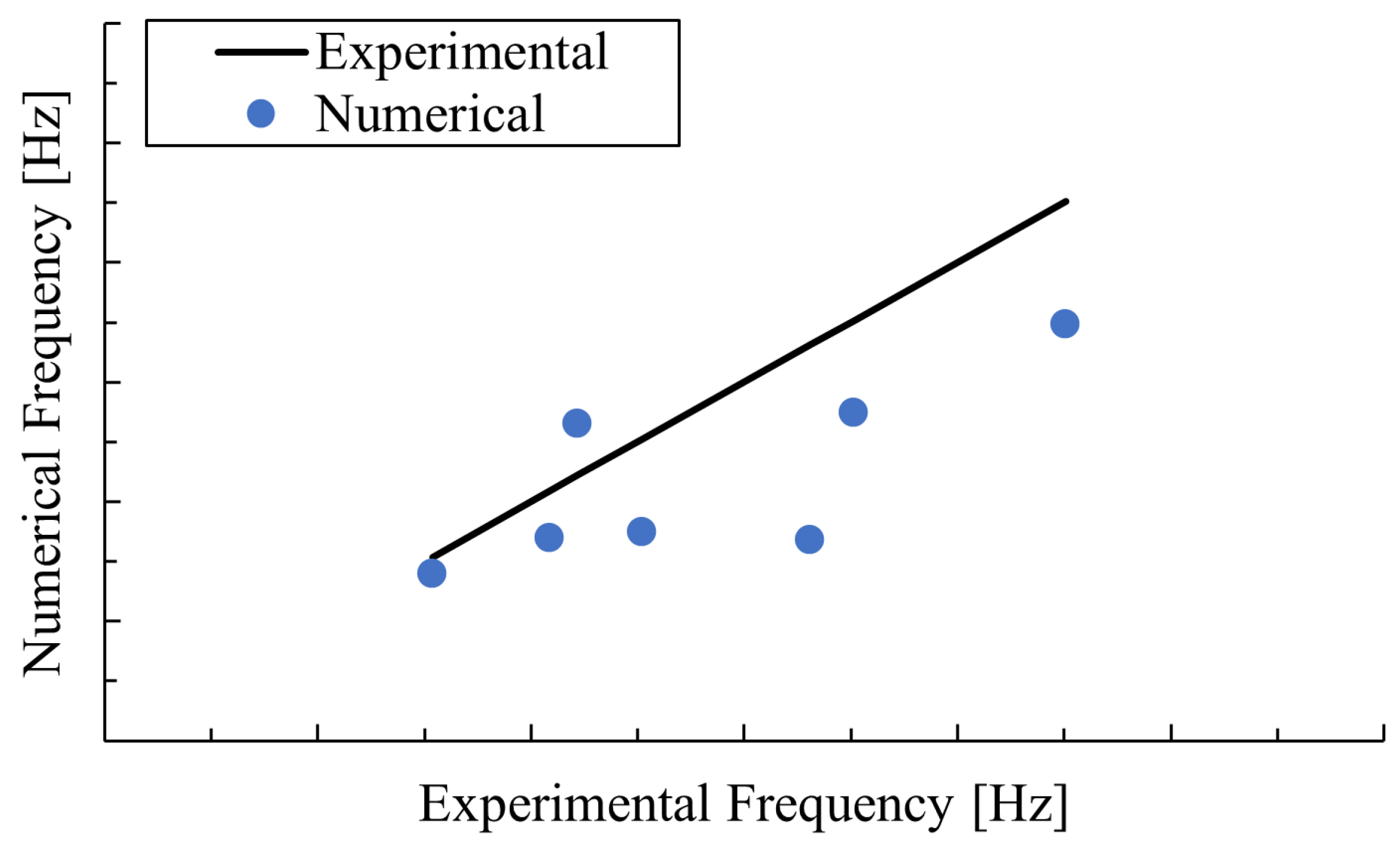 y-bending modes appear. The former is matched in amplitude but shows a slight frequency shift, while the latter is poorly represented. This discrepancy can be attributed in part to cross-axis input components that are only approximately prescribed in the numerical model, allowing certain experimentally excited modes to go unpredicted. Furthermore, the model updating procedure calibrated only the first seven experimental modes, those below approximately 300 Hz, leaving modes in the 300-600 Hz range untuned. Although the influence of these higher modes diminishes with frequency, they still affect the spectra beyond 150 Hz, so their exclusion could account for much of the residual discrepancy observed at higher frequencies. In the