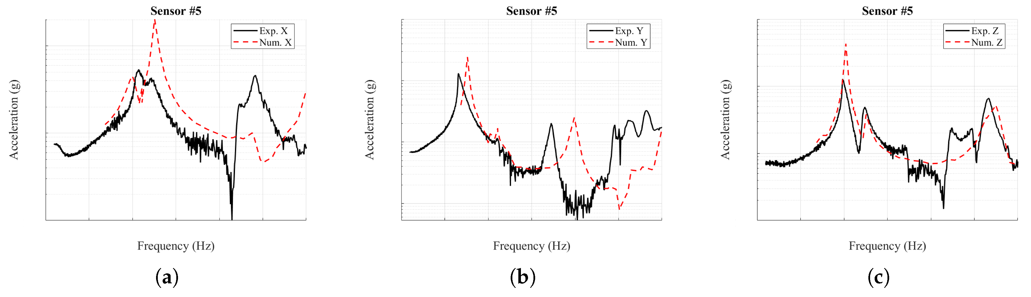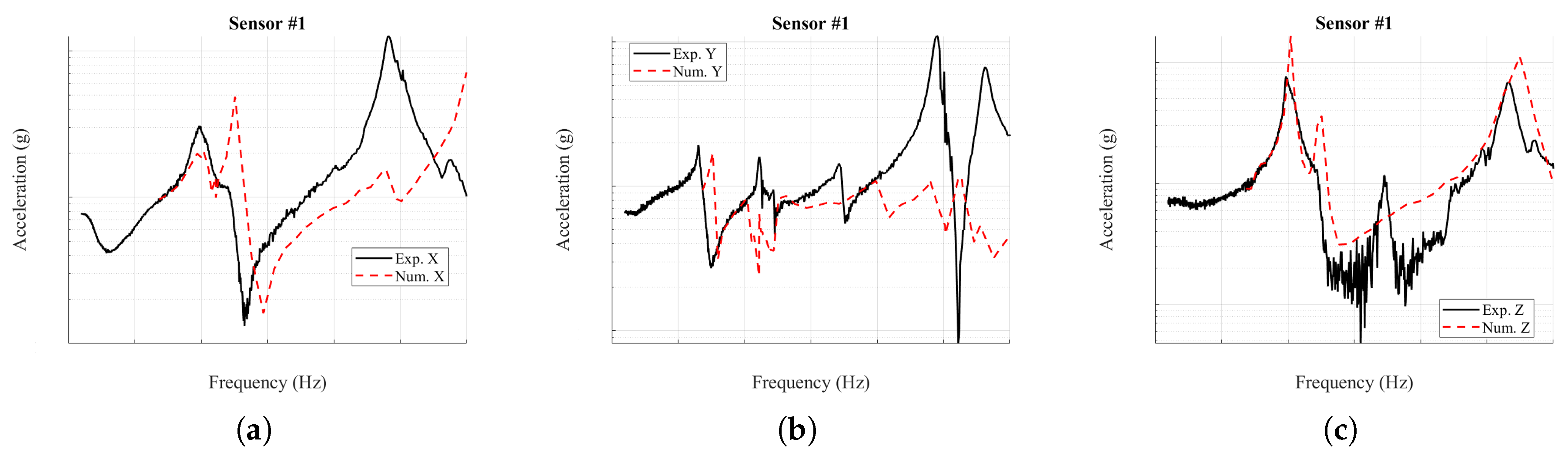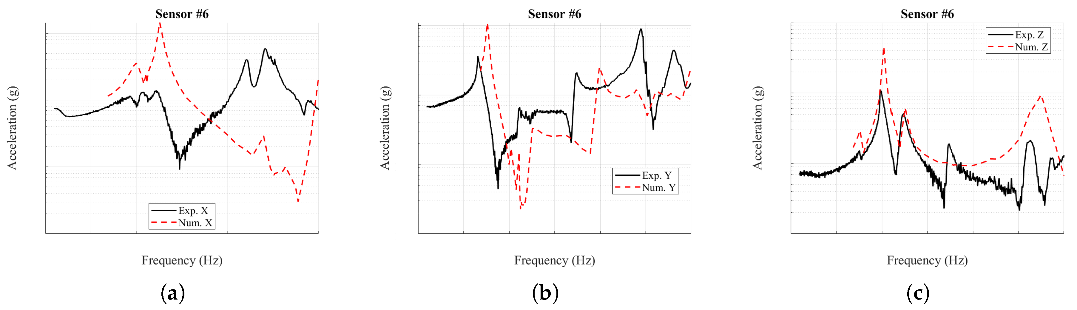 z-direction, the response is captured reasonably well except at sensor #4, where the model predicts a nodal plane inconsistent with the experiment. Smaller peaks produced by mixed-axis excitation appear in the measurements but are absent from the simulations, reflecting the idealized nature of the imposed input in the numerical analysis.