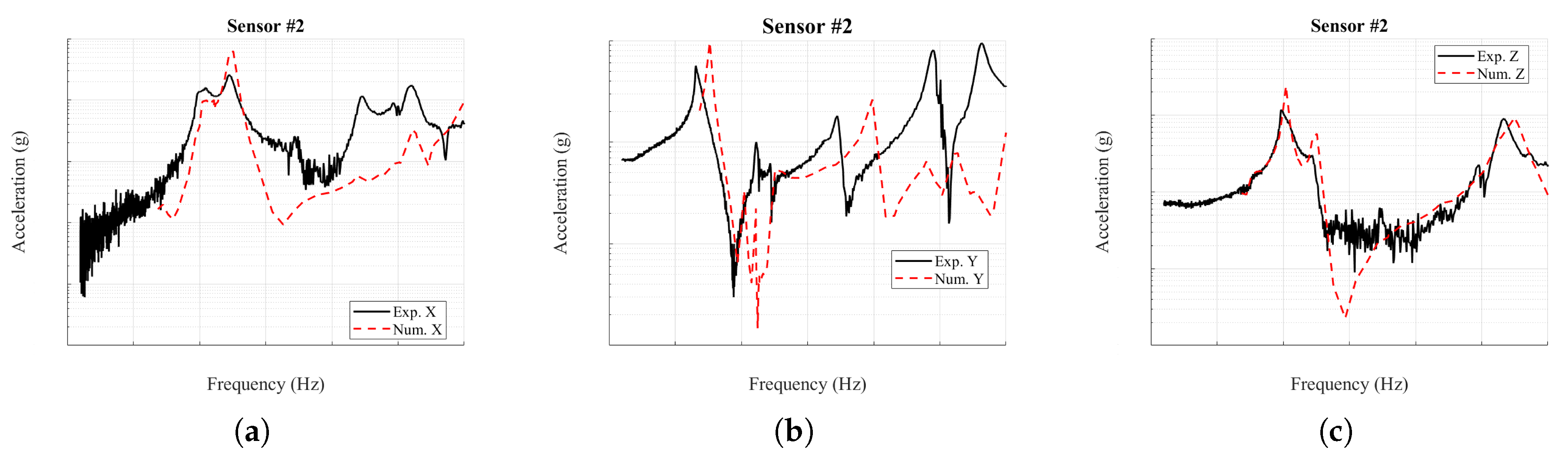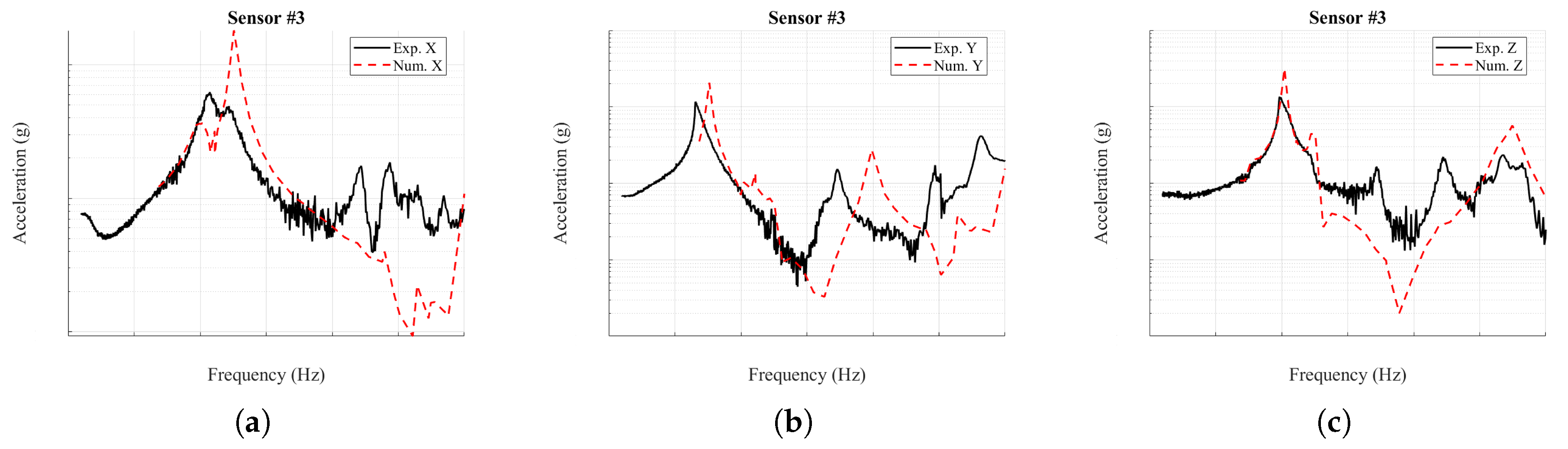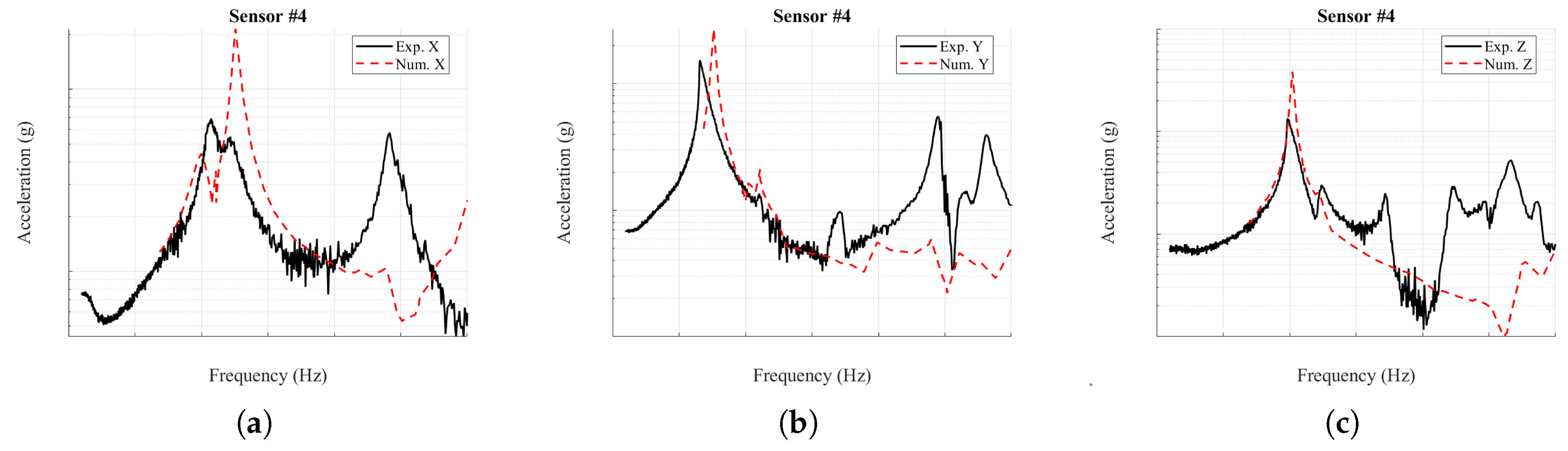 z-direction, the response is captured reasonably well except at sensor #4, where the model predicts a nodal plane inconsistent with the experiment. Smaller peaks produced by mixed-axis excitation appear in the measurements but are absent from the simulations, reflecting the idealized nature of the imposed input in the numerical analysis.