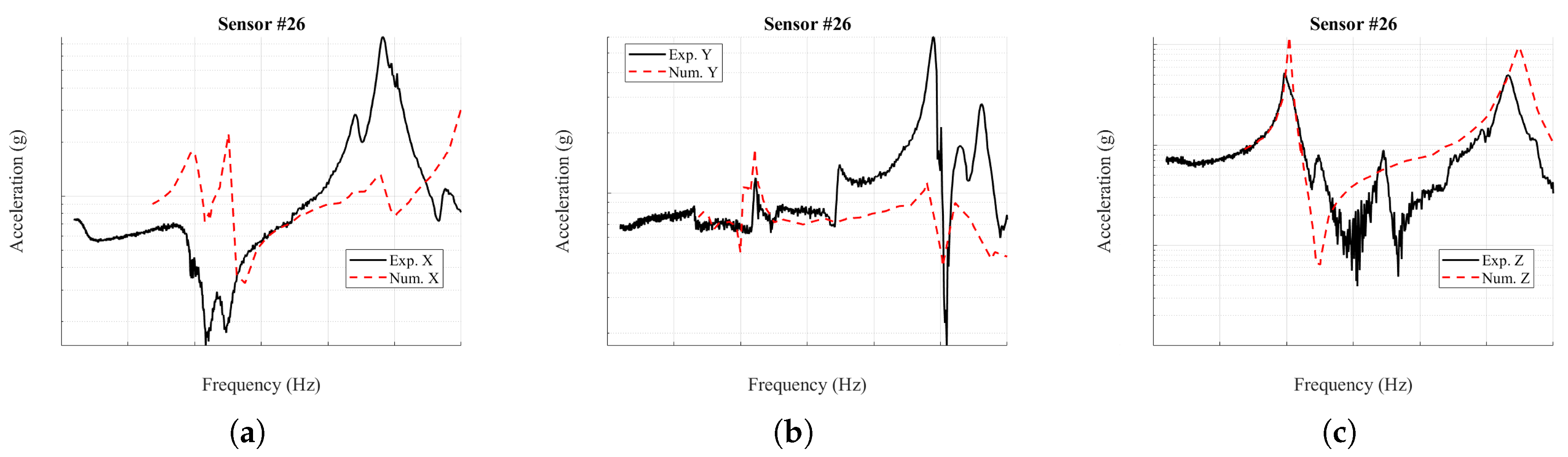 Figure 24 compares the experimentally acquired and numerically simulated acceleration spectra for sensor #26, which is mounted on the stack’s top end-plate. Along the