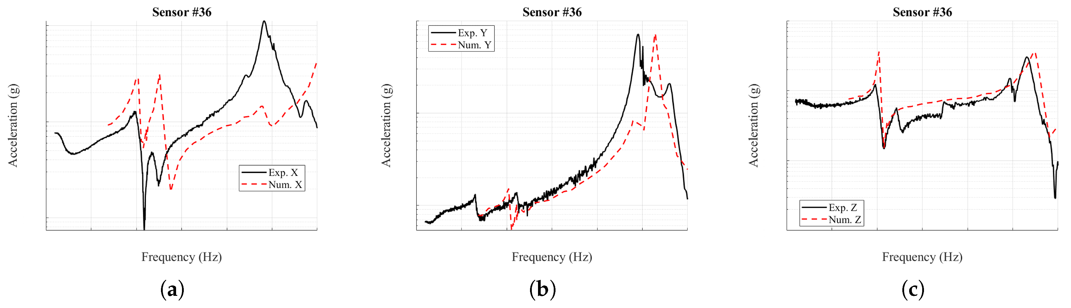 Figure 25 compares the measured and simulated acceleration spectra recorded by sensor #36, mounted on the external cage. Along the