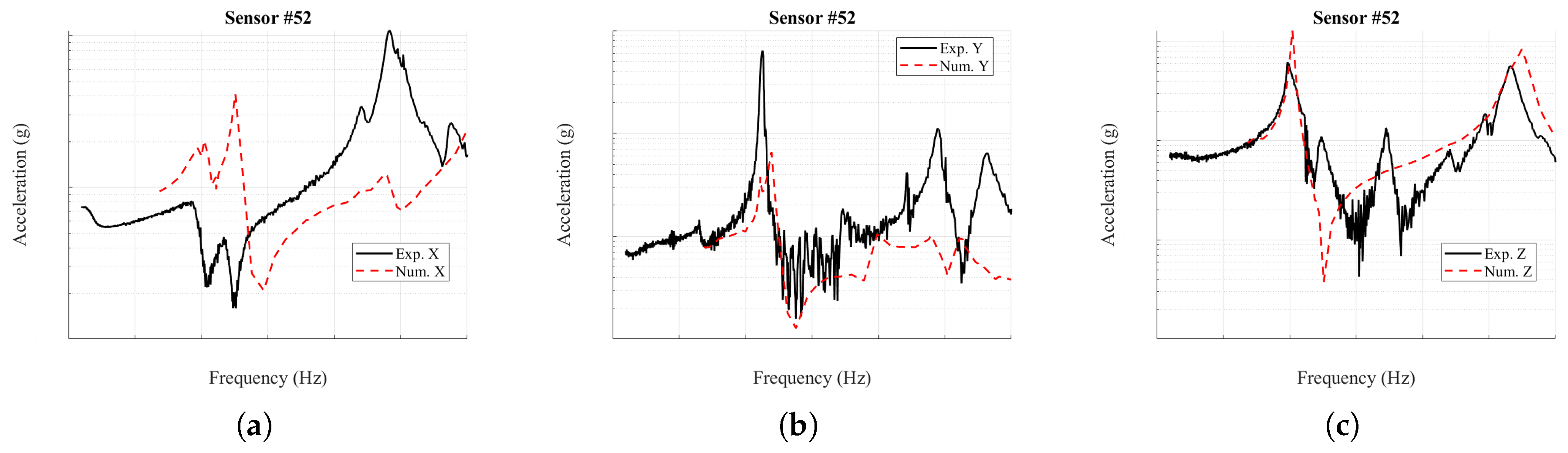 Figure 26 presents the acceleration spectra recorded by sensor #52 on the compression band alongside the corresponding FE predictions. Along the