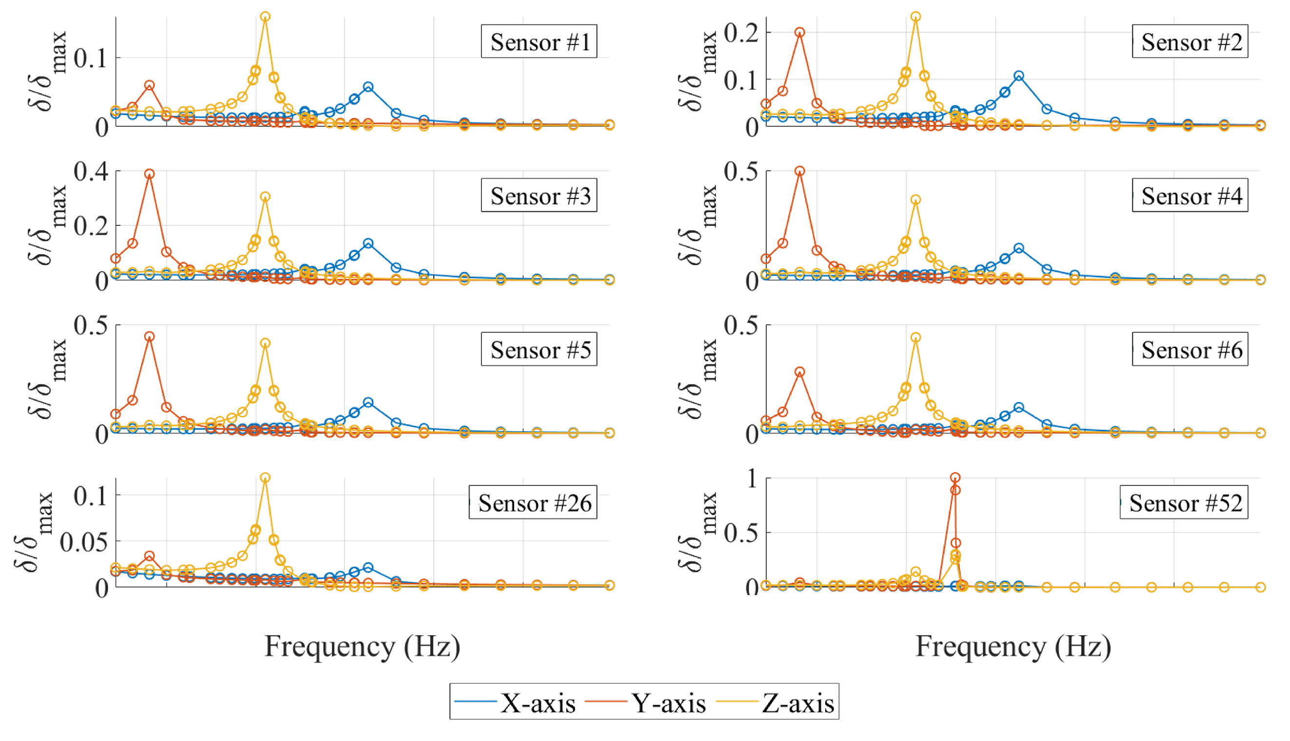 Figure 27 presents a summary of the harmonic response results, showing the ratio of total displacement amplitudes. This ratio is defined as the measured displacement at a given sensor relative to the maximum displacement observed across all sensors. The corresponding acceleration ratio spectra in the three orthogonal directions are shown in
