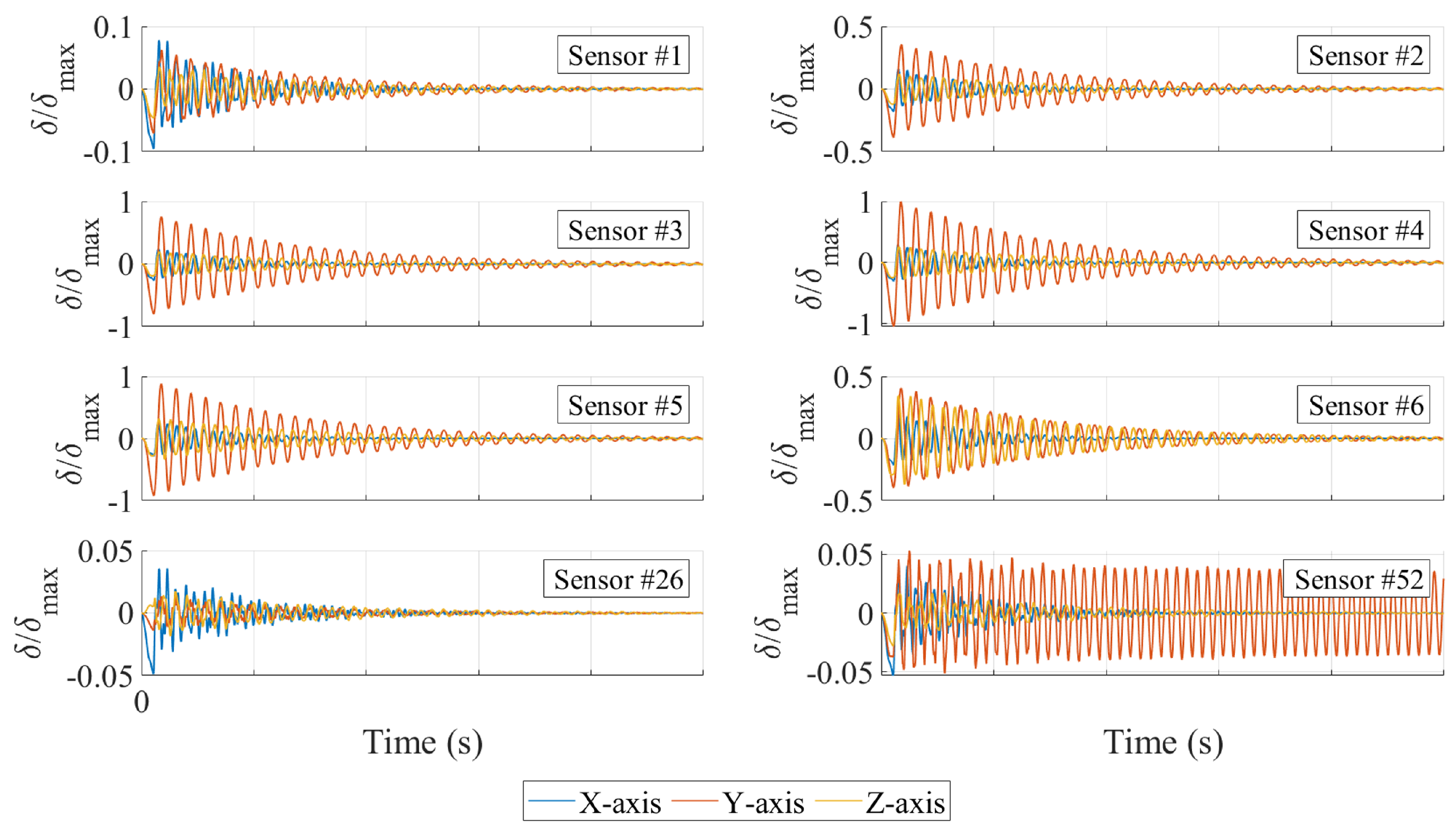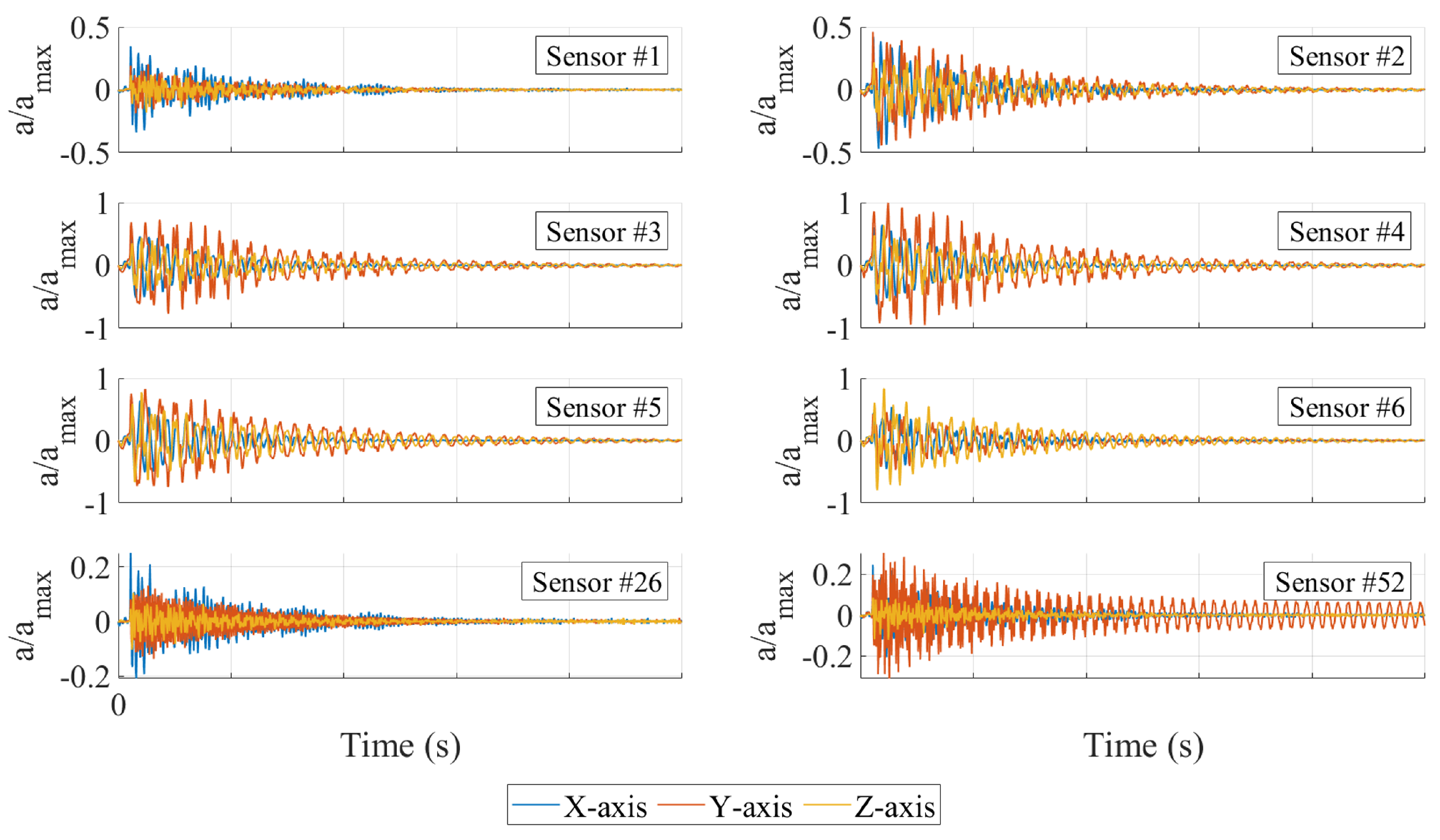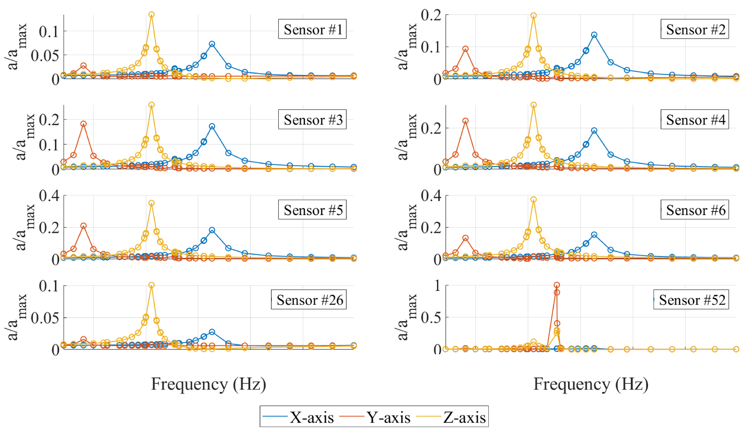 x-axes remain of comparable magnitude at all sensor locations (except for sensor #52).