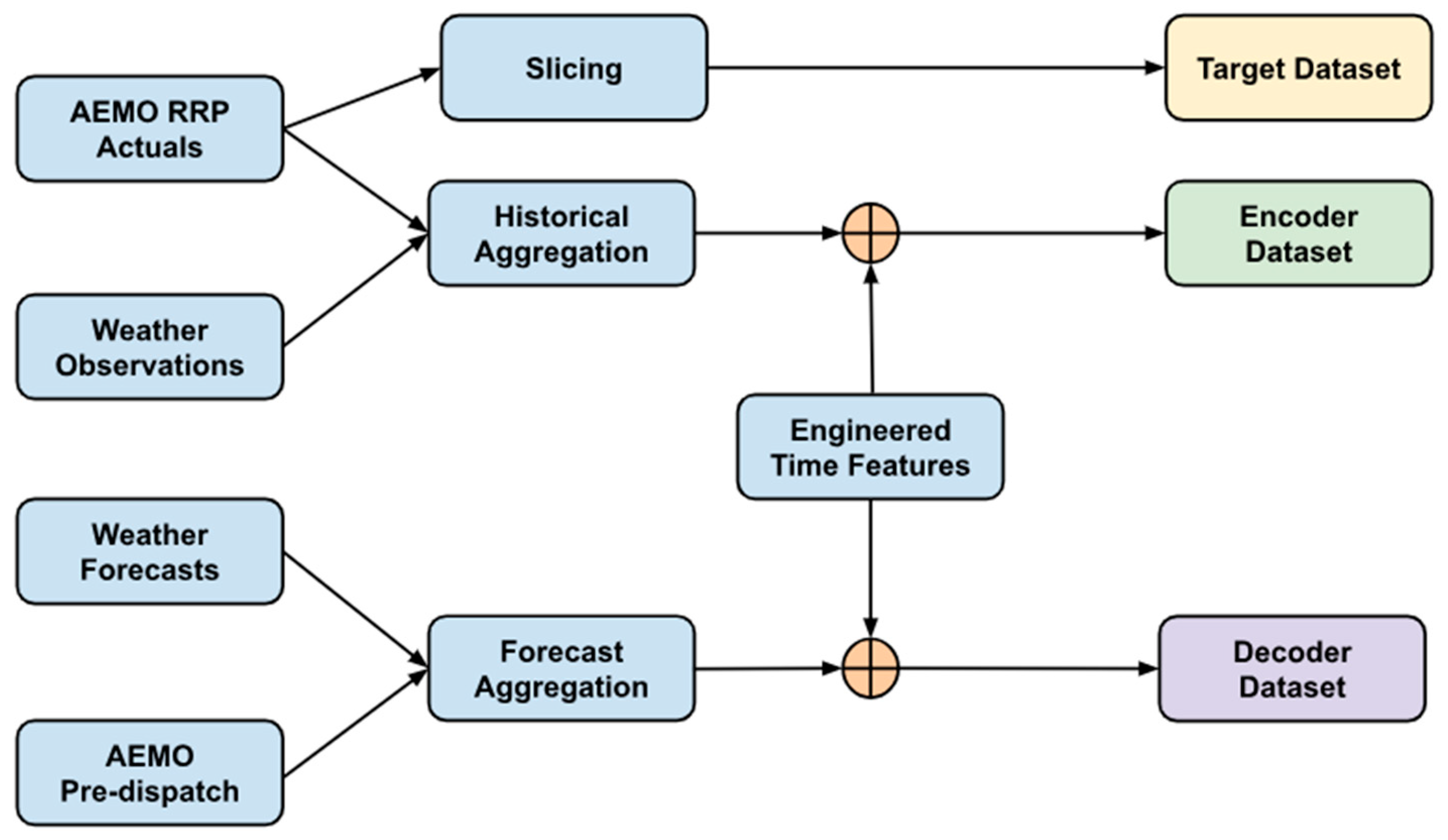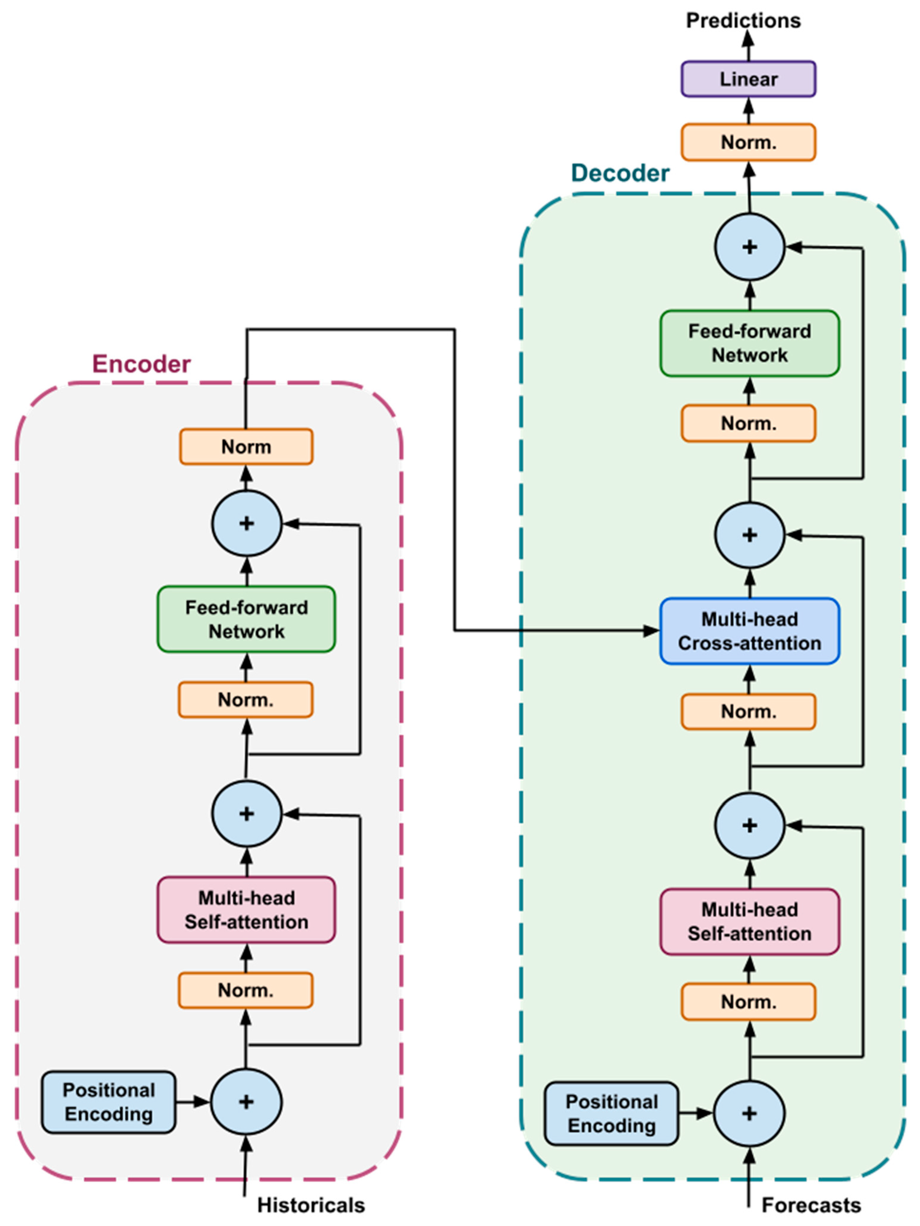 Transformers typically consist of an encoder and a decoder linked by a cross-attention mechanism. The encoder processes the historical sequences, such as RRP, demand, and weather actuals, while the decoder consumes the known future inputs, including AEMO pre-dispatch forecasts and weather forecasts. Both components may be stacked in multiple layers to provide increased representational capacity and enable the model to capture hierarchical temporal patterns across different forecast horizons.