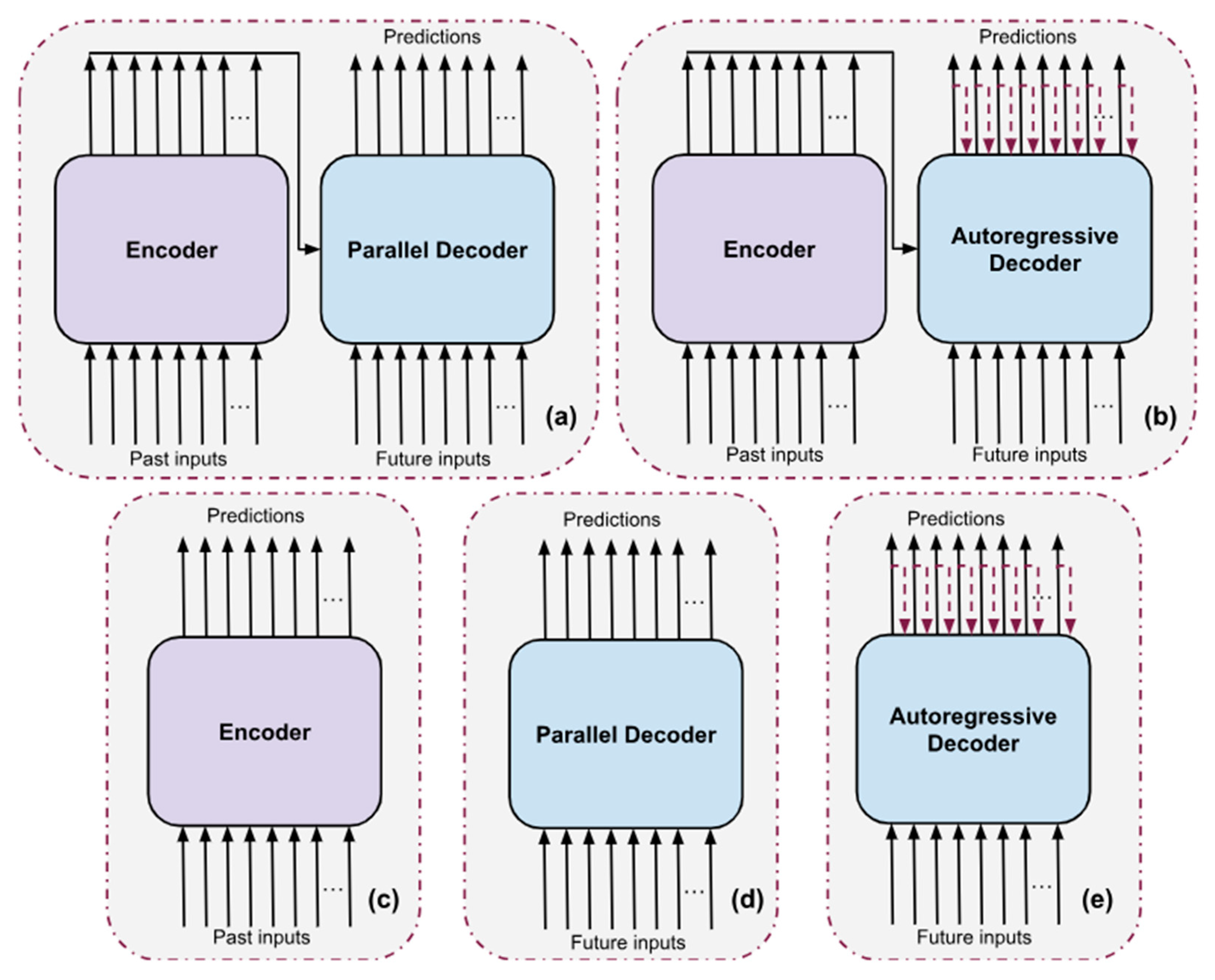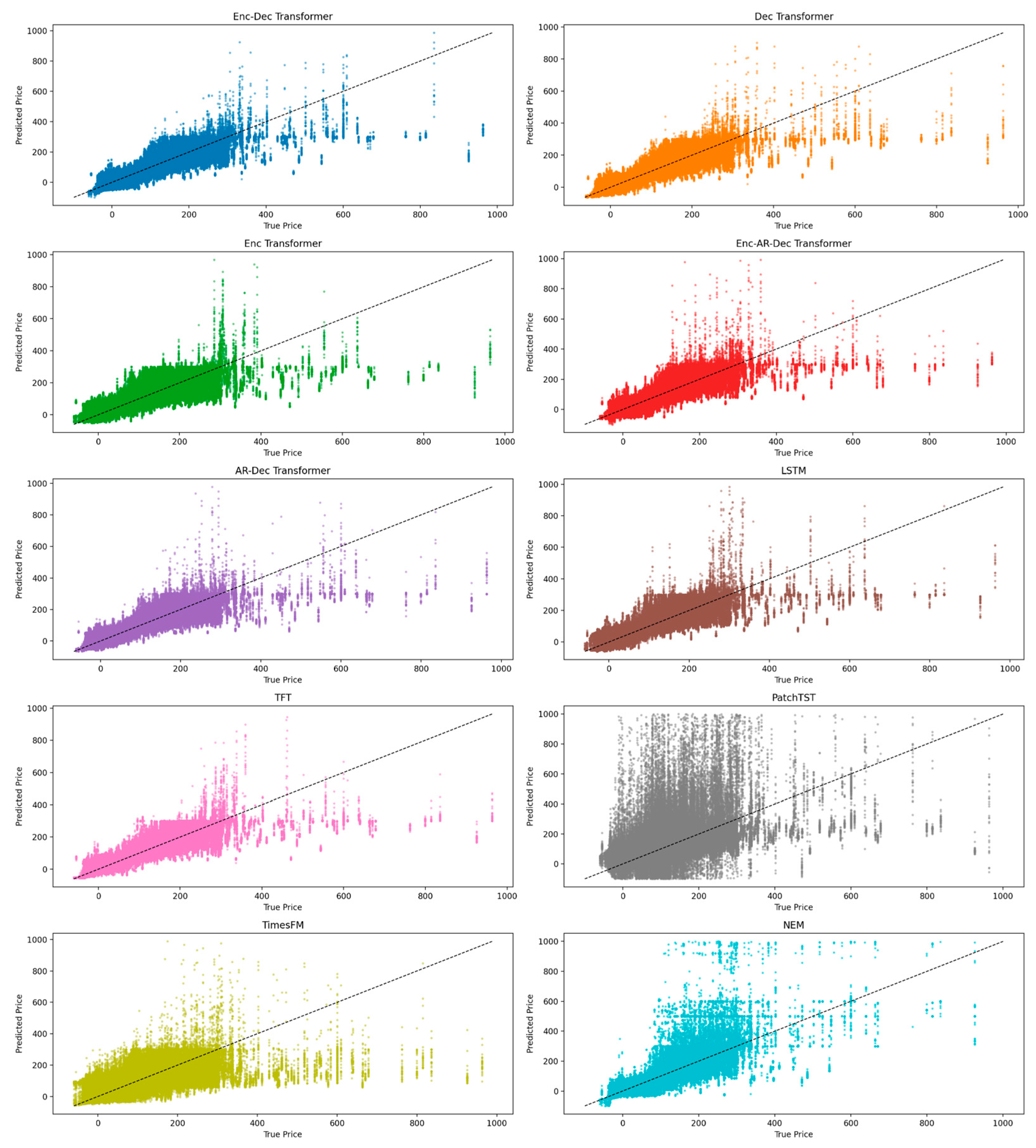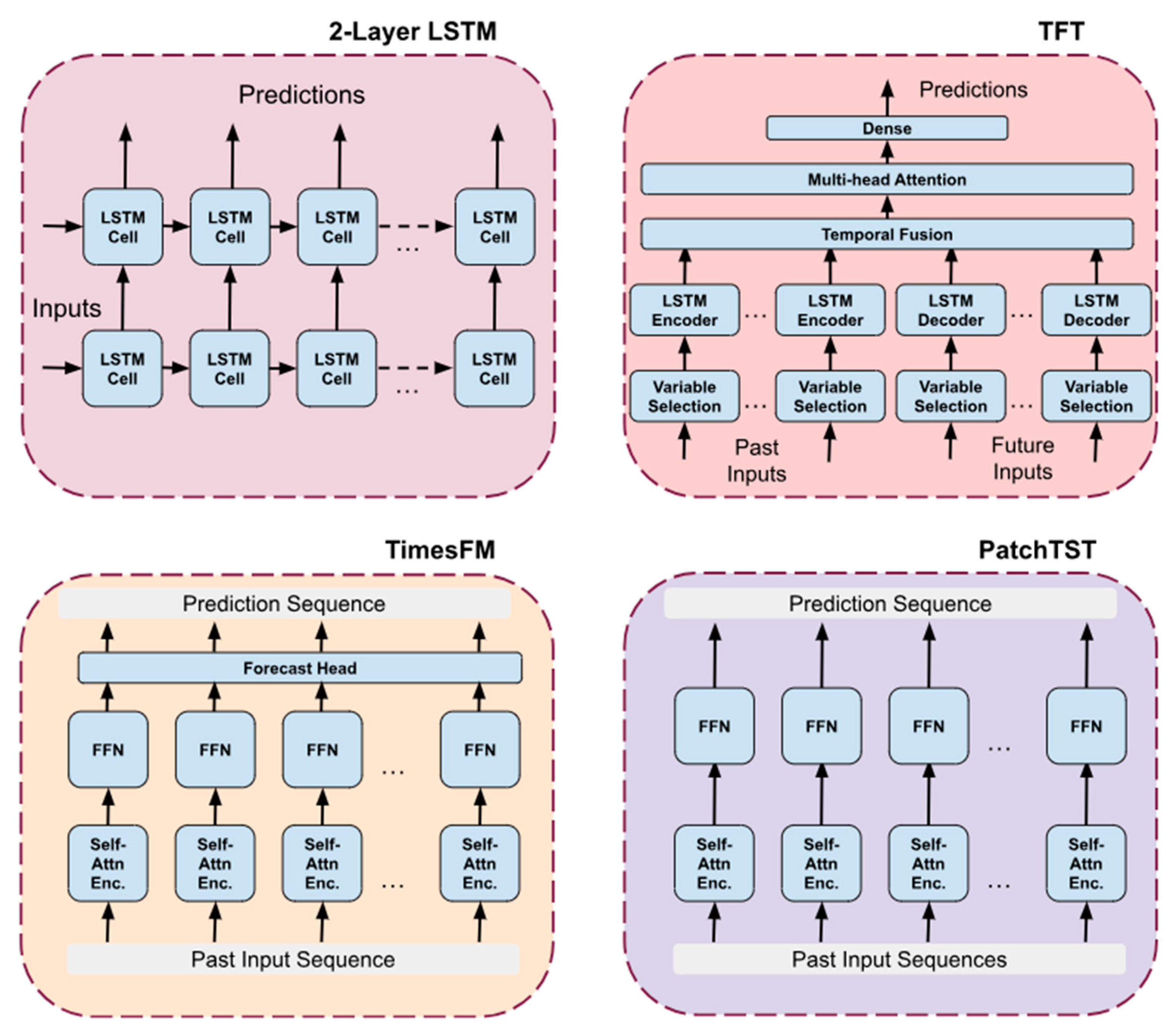 45], were included for comparison. These models were chosen since they were modern state-of-the-art hybrids of each kind of transformer. TimesFM is a decoder-only model, PatchTST is encoder-only, and TFT contains both encoders and decoders. Each of the architectures is shown in